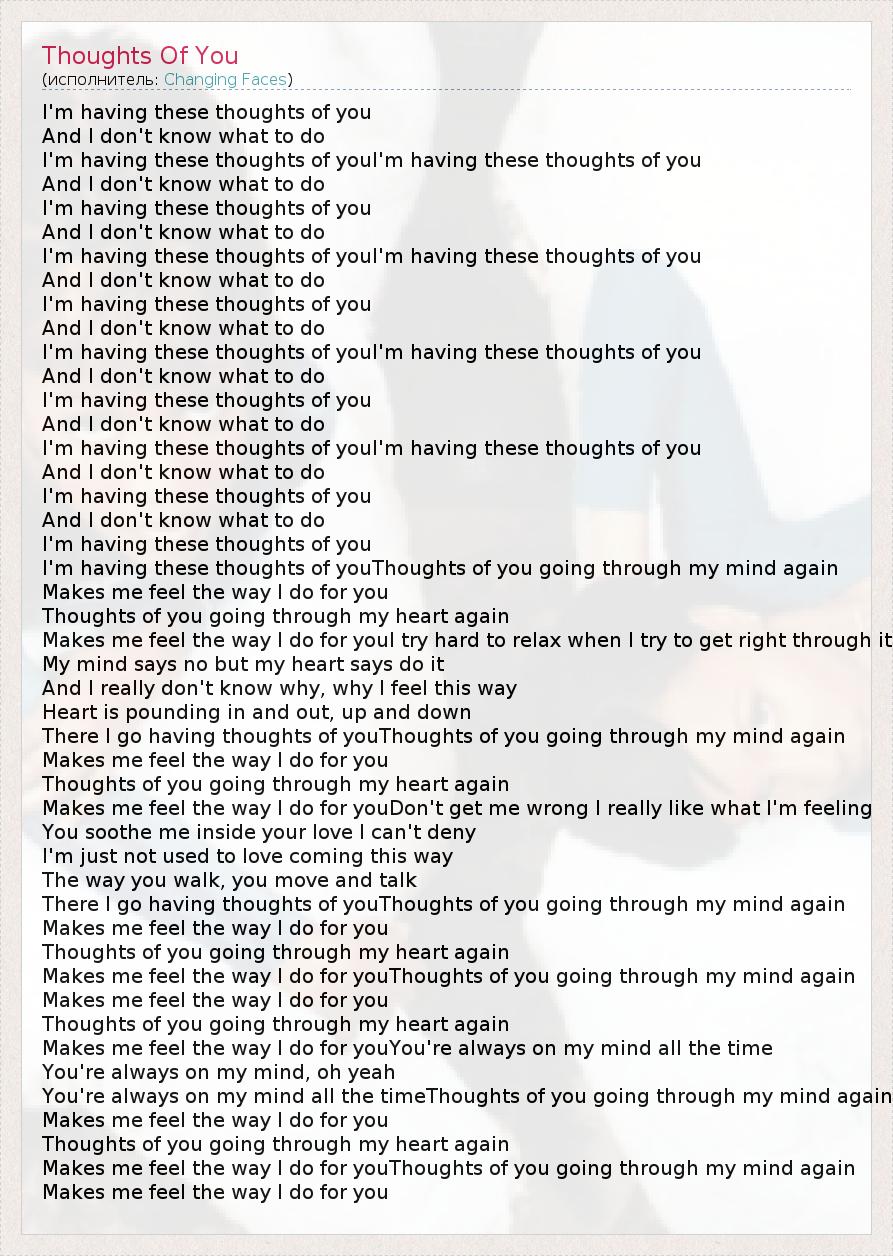 I'm having these thoughts of you And I don't know what to do I'm having these thoughts of youI'm having these thoughts of you And I don't know what to do I'm having these thoughts of you And I don't know what to do I'm having these thoughts of youI'm having these thoughts of you And I don't know what to do I'm having these thoughts of you And I don't know what to do I'm having these thoughts of youI'm having these thoughts of you And I don't know what to do I'm having these thoughts of you And I don't know what to do I'm having these thoughts of youI'm having these thoughts of you And I don't know what to do I'm having these thoughts of you And I don't know what to do I'm having these thoughts of you I'm having these thoughts of youThoughts of you going through my mind again Makes me feel the way I do for you Thoughts of you going through my heart again Makes me feel the way I do for youI try hard to relax when I try to get right through it My mind says no but my heart says do it And I really don't know why, why I feel this way Heart is pounding in and out, up and down There I go having thoughts of youThoughts of you going through my mind again Makes me feel the way I do for you Thoughts of you going through my heart again Makes me feel the way I do for youDon't get me wrong I really like what I'm feeling You soothe me inside your love I can't deny I'm just not used to love coming this way The way you walk, you move and talk There I go having thoughts of youThoughts of you going through my mind again Makes me feel the way I do for you Thoughts of you going through my heart again Makes me feel the way I do for youThoughts of you going through my mind again Makes me feel the way I do for you Thoughts of you going through my heart again Makes me feel the way I do for youYou're always on my mind all the time You're always on my mind, oh yeah You're always on my mind all the timeThoughts of you going through my mind again Makes me feel the way I do for you Thoughts of you going through my heart again Makes me feel the way I do for youThoughts of you going through my mind again Makes me feel the way I do for you