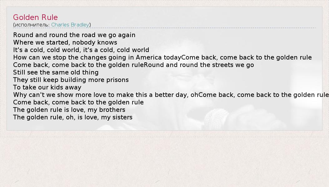 Это интересно:Брэдли шестьдесят пять лет, он вырос в Бруклине, а поворотным моментом в жизни стал концерт Джеймса Брауна. В пятьдесят один он наконец-то начал выступать так, как хотел всегда - со своими музыкантами в клубах Бруклина. До этого больше двадцати лет в Калифорнии, а до нее случайно оказался на Аляске; шеф-повар на три с половиной тысячи человек. в одном из клубов Бруклина его услышала женщина... продолжение