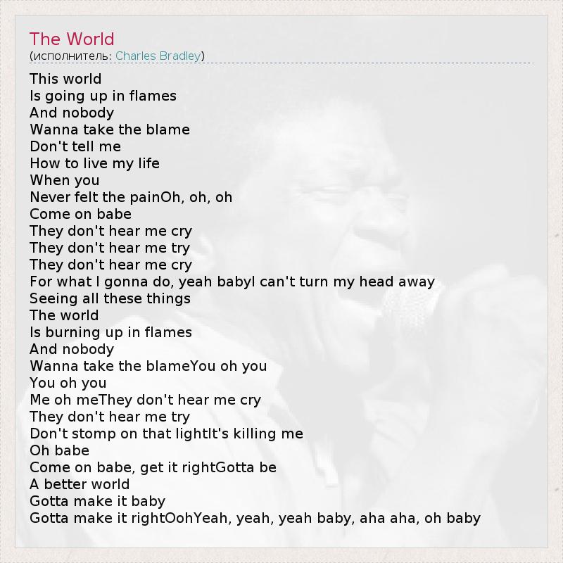 This world Is going up in flames And nobody Wanna take the blame Don't tell me How to live my life When you Never felt the painOh, oh, oh Come on babe They don't hear me cry They don't hear me try They don't hear me cry For what I gonna do, yeah babyI can't turn my head away Seeing all these things The world Is burning up in flames And nobody Wanna take the blameYou oh you You oh you Me oh meThey don't hear me cry They don't hear me try Don't stomp on that lightIt's killing me Oh babe Come on babe, get it rightGotta be A better world Gotta make it baby Gotta make it rightOohYeah, yeah, yeah baby, aha aha, oh baby