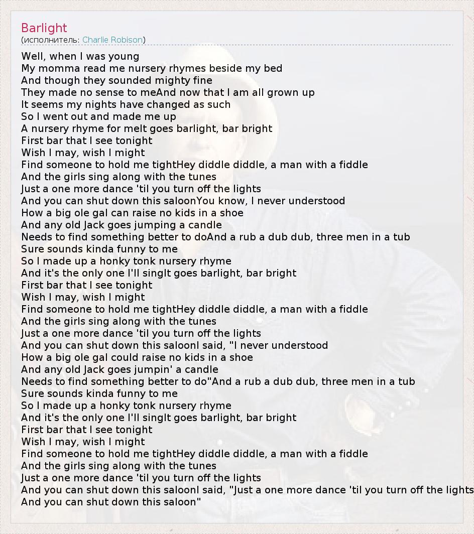 Well, when I was young My momma read me nursery rhymes beside my bed And though they sounded mighty fine They made no sense to meAnd now that I am all grown up It seems my nights have changed as such So I went out and made me up A nursery rhyme for meIt goes barlight, bar bright First bar that I see tonight Wish I may, wish I might Find someone to hold me tightHey diddle diddle, a man with a fiddle And the girls sing along with the tunes Just a one more dance 'til you turn off the lights And you can shut down this saloonYou know, I never understood How a big ole gal can raise no kids in a shoe And any old Jack goes jumping a candle Needs to find something better to doAnd a rub a dub dub, three men in a tub Sure sounds kinda funny to me So I made up a honky tonk nursery rhyme And it's the only one I'll singIt goes barlight, bar bright First bar that I see tonight Wish I may, wish I might Find someone to hold me tightHey diddle diddle, a man with a fiddle And the girls sing along with the tunes Just a one more dance 'til you turn off the lights And you can shut down this saloonI said, "I never understood How a big ole gal could raise no kids in a shoe And any old Jack goes jumpin' a candle Needs to find something better to do"And a rub a dub dub, three men in a tub Sure sounds kinda funny to me So I made up a honky tonk nursery rhyme And it's the only one I'll singIt goes barlight, bar bright First bar that I see tonight Wish I may, wish I might Find someone to hold me tightHey diddle diddle, a man with a fiddle And the girls sing along with the tunes Just a one more dance 'til you turn off the lights And you can shut down this saloonI said, "Just a one more dance 'til you turn off the lights And you can shut down this saloon"