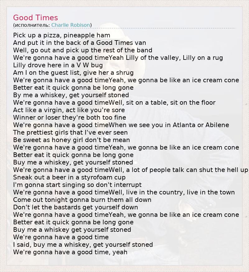 Pick up a pizza, pineapple ham And put it in the back of a Good Times van Well, go out and pick up the rest of the band We're gonna have a good timeYeah Lilly of the valley, Lilly on a rug Lilly drove here in a V W bug Am I on the guest list, give her a shrug We're gonna have a good timeYeah, we gonna be like an ice cream cone Better eat it quick gonna be long gone By me a whiskey, get yourself stoned We're gonna have a good timeWell, sit on a table, sit on the floor Act like a virgin, act like you're sore Winner or loser they're both too fine We're gonna have a good timeWhen we see you in Atlanta or Abilene The prettiest girls that I've ever seen Be sweet as honey girl don't be mean We're gonna have a good timeYeah, we gonna be like an ice cream cone Better eat it quick gonna be long gone Buy me a whiskey, get yourself stoned We're gonna have a good timeWell, a lot of people talk can shut the hell up Sneak out a beer in a styrofoam cup I'm gonna start singing so don't interrupt We're gonna have a good timeWell, live in the country, live in the town Come out tonight gonna burn them all down Don't let the bastards get yourself down We're gonna have a good timeYeah, we gonna be like an ice cream cone Better eat it quick gonna be long gone Buy me a whiskey get yourself stoned We're gonna have a good time I said, buy me a whiskey, get yourself stoned We're gonna have a good time, yeah