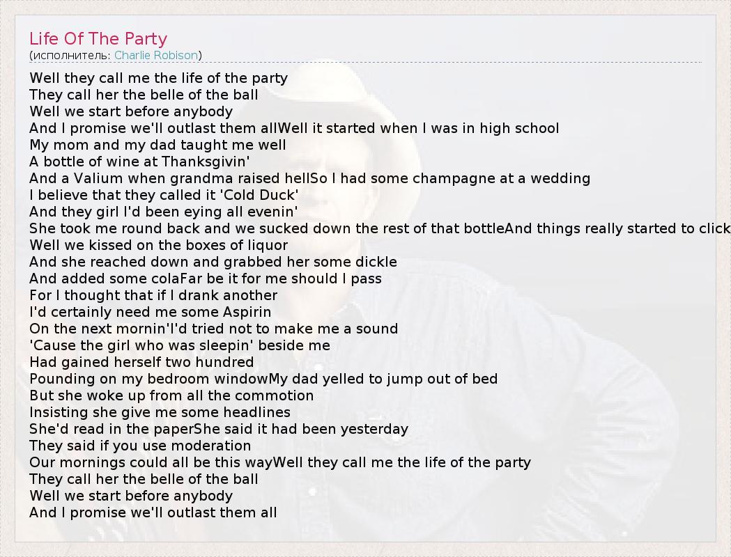Well they call me the life of the party They call her the belle of the ball Well we start before anybody And I promise we'll outlast them allWell it started when I was in high school My mom and my dad taught me well A bottle of wine at Thanksgivin' And a Valium when grandma raised hellSo I had some champagne at a wedding I believe that they called it 'Cold Duck' And they girl I'd been eying all evenin' She took me round back and we sucked down the rest of that bottleAnd things really started to click Well we kissed on the boxes of liquor And she reached down and grabbed her some dickle And added some colaFar be it for me should I pass For I thought that if I drank another I'd certainly need me some Aspirin On the next mornin'I'd tried not to make me a sound 'Cause the girl who was sleepin' beside me Had gained herself two hundred Pounding on my bedroom windowMy dad yelled to jump out of bed But she woke up from all the commotion Insisting she give me some headlines She'd read in the paperShe said it had been yesterday They said if you use moderation Our mornings could all be this wayWell they call me the life of the party They call her the belle of the ball Well we start before anybody And I promise we'll outlast them all