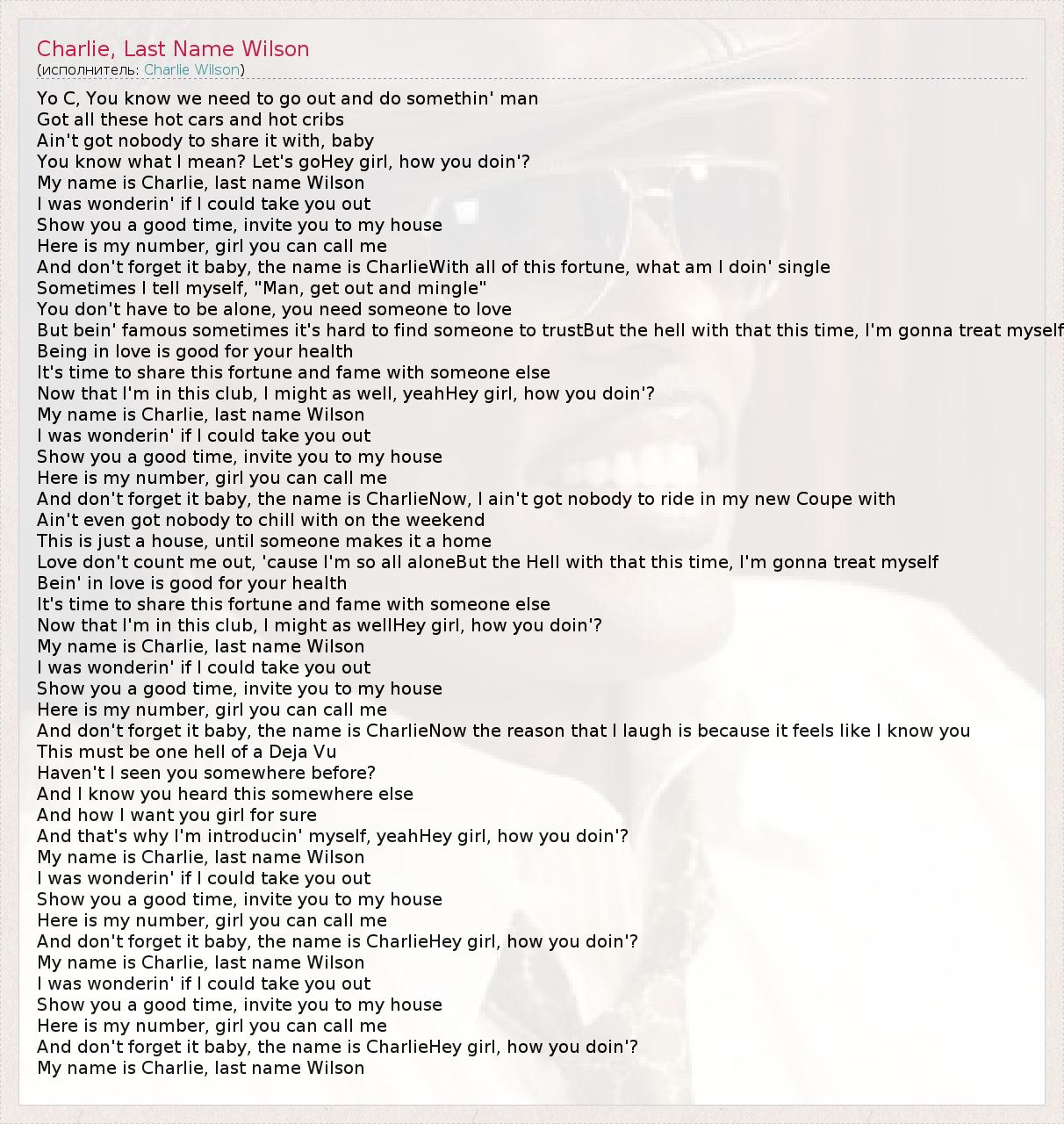 Yo C, You know we need to go out and do somethin' man Got all these hot cars and hot cribs Ain't got nobody to share it with, baby You know what I mean? Let's goHey girl, how you doin'? My name is Charlie, last name Wilson I was wonderin' if I could take you out Show you a good time, invite you to my house Here is my number, girl you can call me And don't forget it baby, the name is CharlieWith all of this fortune, what am I doin' single Sometimes I tell myself, "Man, get out and mingle" You don't have to be alone, you need someone to love But bein' famous sometimes it's hard to find someone to trustBut the hell with that this time, I'm gonna treat myself Being in love is good for your health It's time to share this fortune and fame with someone else Now that I'm in this club, I might as well, yeahHey girl, how you doin'? My name is Charlie, last name Wilson I was wonderin' if I could take you out Show you a good time, invite you to my house Here is my number, girl you can call me And don't forget it baby, the name is CharlieNow, I ain't got nobody to ride in my new Coupe with Ain't even got nobody to chill with on the weekend This is just a house, until someone makes it a home Love don't count me out, 'cause I'm so all aloneBut the Hell with that this time, I'm gonna treat myself Bein' in love is good for your health It's time to share this fortune and fame with someone else Now that I'm in this club, I might as wellHey girl, how you doin'? My name is Charlie, last name Wilson I was wonderin' if I could take you out Show you a good time, invite you to my house Here is my number, girl you can call me And don't forget it baby, the name is CharlieNow the reason that I laugh is because it feels like I know you This must be one hell of a Deja Vu Haven't I seen you somewhere before? And I know you heard this somewhere else And how I want you girl for sure And that's why I'm introducin' myself, yeahHey girl, how you doin'? My name is Charlie, last name Wilson I was wonderin' if I could take you out Show you a good time, invite you to my house Here is my number, girl you can call me And don't forget it baby, the name is CharlieHey girl, how you doin'? My name is Charlie, last name Wilson I was wonderin' if I could take you out Show you a good time, invite you to my house Here is my number, girl you can call me And don't forget it baby, the name is CharlieHey girl, how you doin'? My name is Charlie, last name Wilson