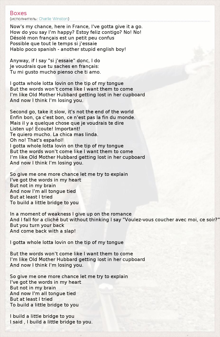 Сейчас у меня есть шанс, здесь, во Франции, я должен им воспользоваться. Как вы говорите, я счастлив? Я счастлив с тобой (исп.)? Нет! Нет! Извините, мой французский немного запутан, Возможно, всегда, когда я пробую. Я говорю немного по-испански (исп.) - еще один глупый английский мальчик! Так или иначе, если я говорю, «я попробую» (фр.) таким образом, я Я хочу, чтобы вы знали по-французски: Вы мне очень нравитесь, думаю, что я люблю Вас. (исп.) Мне надо высказать всю эту большую любовь, что на кончике языка, Но слова не придут так, как я хочу. Я, как матушка Хаббард, заблудившаяся в шкафу, И теперь я думаю, что теряю тебя. Второй раз, делай это медленно, это не конец света. Во всяком случае, это хорошо, это не конец света. (фр.) Но есть то, что я хочу вам сказать. (фр.) Слушайте! Слушай! Важно! (фр.) Я люблю тебя. Самая красивая девушка. (исп.) О, нет! Это испанский! Мне надо высказать всю эту большую любовь, что на кончике языка, Но слова не придут так, как я хочу. Я, как матушка Хаббард, заблудившаяся в шкафу, И теперь я думаю, что теряю тебя. Так дайте мне еще один шанс, дайте мне попытаться объяснить. У меня слова в моем сердце, Но не в моем мозгу. И теперь мой язык связан (я не могу складно говорить), Но, по крайней, мере я попытался Построить мостик к вам. В минуту слабости я отказываюсь от романтики. И я падаю на клише, но, не думая я говорю: «Ты не хочешь провести эту ночь со мной?» (фр.) Но ты повернешься спиной И вернешься с пощечиной! Мне надо высказать всю эту большую любовь, что на кончике языка, Но слова не придут так, как я хочу. Я, как матушка Хаббард, заблудившаяся в шкафу, И теперь я думаю, что теряю тебя. Так дайте мне еще один шанс, дайте мне попытаться объяснить. У меня слова в моем сердце, Но не в моем мозгу. И теперь мой язык связан (я не могу складно говорить), Но, по крайней, мере я попытался Построить мостик к Вам. Я строю мостик к Вам Я сказал, я строю мостик к Вам.