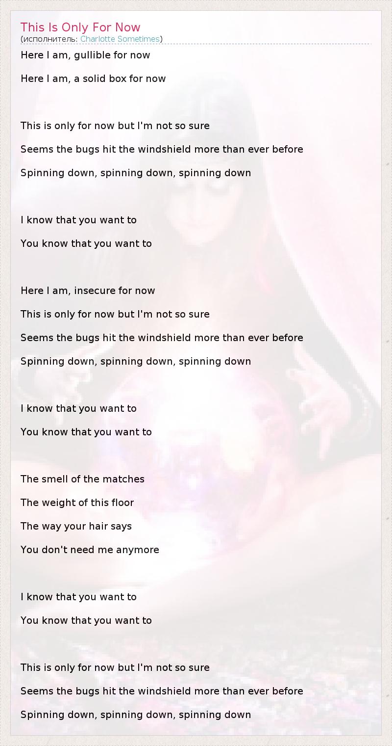 Here I am, gullible for now Here I am, a solid box for now This is only for now but I'm not so sure Seems the bugs hit the windshield more than ever before Spinning down, spinning down, spinning down I know that you want to You know that you want to Here I am, insecure for now This is only for now but I'm not so sure Seems the bugs hit the windshield more than ever before Spinning down, spinning down, spinning down I know that you want to You know that you want to The smell of the matches The weight of this floor The way your hair says You don't need me anymore I know that you want to You know that you want to This is only for now but I'm not so sure Seems the bugs hit the windshield more than ever before Spinning down, spinning down, spinning down