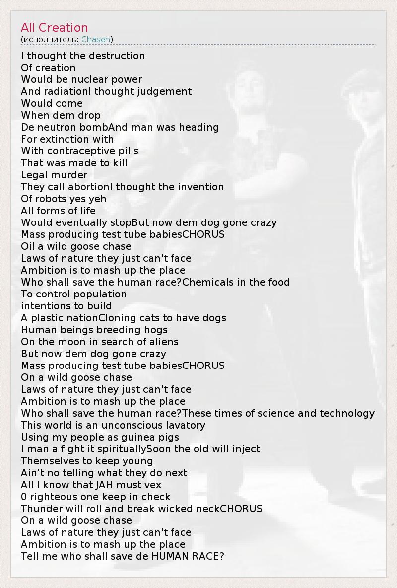 I thought the destruction Of creation Would be nuclear power And radiationI thought judgement Would come When dem drop De neutron bombAnd man was heading For extinction with With contraceptive pills That was made to kill Legal murder They call abortionI thought the invention Of robots yes yeh All forms of life Would eventually stopBut now dem dog gone crazy Mass producing test tube babiesCHORUS Oil a wild goose chase Laws of nature they just can't face Ambition is to mash up the place Who shall save the human race?Chemicals in the food To control population intentions to build A plastic nationCloning cats to have dogs Human beings breeding hogs On the moon in search of aliens But now dem dog gone crazy Mass producing test tube babiesCHORUS On a wild goose chase Laws of nature they just can't face Ambition is to mash up the place Who shall save the human race?These times of science and technology This world is an unconscious lavatory Using my people as guinea pigs I man a fight it spirituallySoon the old will inject Themselves to keep young Ain't no telling what they do next All I know that JAH must vex 0 righteous one keep in check Thunder will roll and break wicked neckCHORUS On a wild goose chase Laws of nature they just can't face Ambition is to mash up the place Tell me who shall save de HUMAN RACE?
