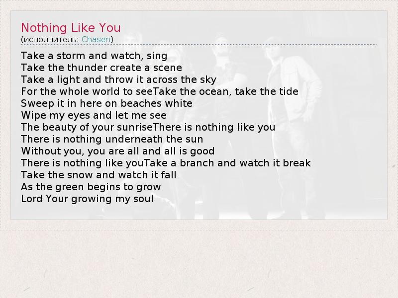 Take a storm and watch, sing Take the thunder create a scene Take a light and throw it across the sky For the whole world to seeTake the ocean, take the tide Sweep it in here on beaches white Wipe my eyes and let me see The beauty of your sunriseThere is nothing like you There is nothing underneath the sun Without you, you are all and all is good There is nothing like youTake a branch and watch it break Take the snow and watch it fall As the green begins to grow Lord Your growing my soul