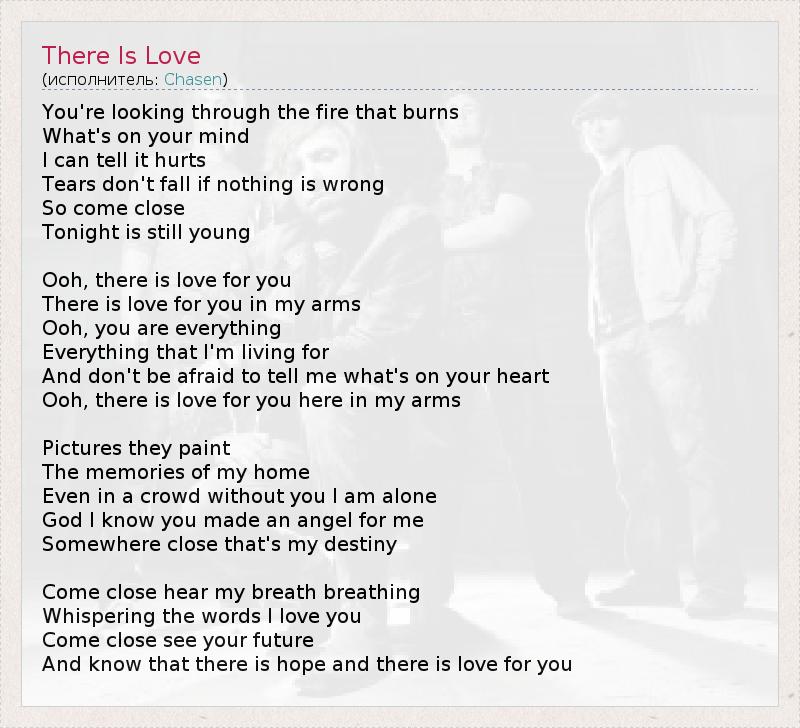 You're looking through the fire that burns What's on your mind I can tell it hurts Tears don't fall if nothing is wrong So come close Tonight is still young Ooh, there is love for you There is love for you in my arms Ooh, you are everything Everything that I'm living for And don't be afraid to tell me what's on your heart Ooh, there is love for you here in my arms Pictures they paint The memories of my home Even in a crowd without you I am alone God I know you made an angel for me Somewhere close that's my destiny Come close hear my breath breathing Whispering the words I love you Come close see your future And know that there is hope and there is love for you