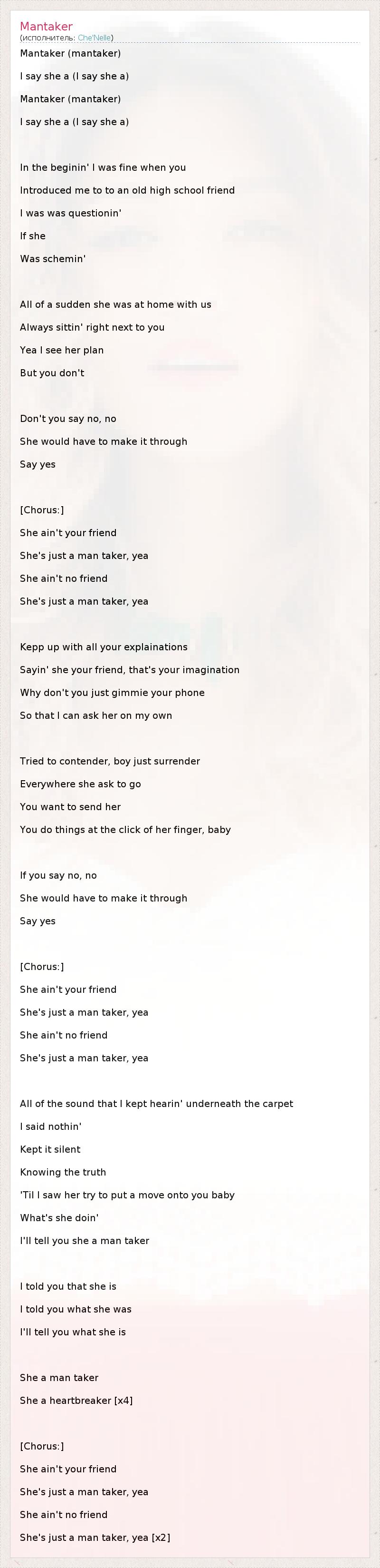 Mantaker (mantaker) I say she a (I say she a) Mantaker (mantaker) I say she a (I say she a) In the beginin' I was fine when you Introduced me to to an old high school friend I was was questionin' If she Was schemin' All of a sudden she was at home with us Always sittin' right next to you Yea I see her plan But you don't Don't you say no, no She would have to make it through Say yes [Chorus:] She ain't your friend She's just a man taker, yea She ain't no friend She's just a man taker, yea Kepp up with all your explainations Sayin' she your friend, that's your imagination Why don't you just gimmie your phone So that I can ask her on my own Tried to contender, boy just surrender Everywhere she ask to go You want to send her You do things at the click of her finger, baby If you say no, no She would have to make it through Say yes [Chorus:] She ain't your friend She's just a man taker, yea She ain't no friend She's just a man taker, yea All of the sound that I kept hearin' underneath the carpet I said nothin' Kept it silent Knowing the truth 'Til I saw her try to put a move onto you baby What's she doin' I'll tell you she a man taker I told you that she is I told you what she was I'll tell you what she is She a man taker She a heartbreaker [x4] [Chorus:] She ain't your friend She's just a man taker, yea She ain't no friend She's just a man taker, yea [x2]