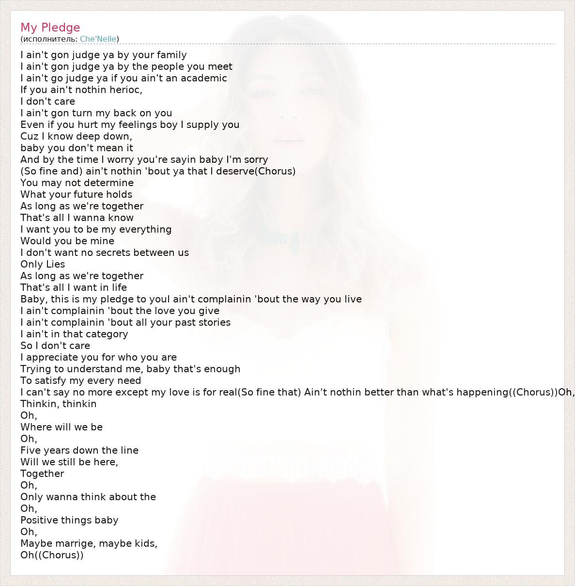 I ain't gon judge ya by your family I ain't gon judge ya by the people you meet I ain't go judge ya if you ain't an academic If you ain't nothin herioc, I don't care I ain't gon turn my back on you Even if you hurt my feelings boy I supply you Cuz I know deep down, baby you don't mean it And by the time I worry you're sayin baby I'm sorry (So fine and) ain't nothin 'bout ya that I deserve(Chorus) You may not determine What your future holds As long as we're together That's all I wanna know I want you to be my everything Would you be mine I don't want no secrets between us Only Lies As long as we're together That's all I want in life Baby, this is my pledge to youI ain't complainin 'bout the way you live I ain't complainin 'bout the love you give I ain't complainin 'bout all your past stories I ain't in that category So I don't care I appreciate you for who you are Trying to understand me, baby that's enough To satisfy my every need I can't say no more except my love is for real(So fine that) Ain't nothin better than what's happening((Chorus))Oh, Thinkin, thinkin Oh, Where will we be Oh, Five years down the line Will we still be here, Together Oh, Only wanna think about the Oh, Positive things baby Oh, Maybe marrige, maybe kids, Oh((Chorus))