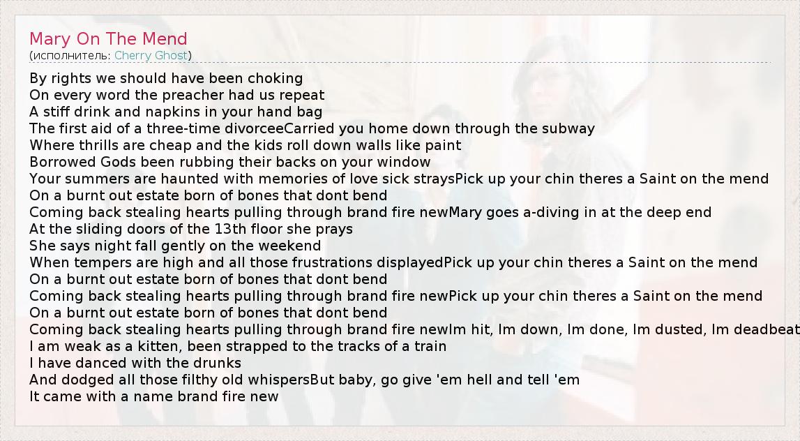 Это интересно:Cherry Ghost is a British indie rock band led by Simon Aldred. They formed in Bolton in 2005 and currently enjoy considerable airplay on BBC Radio 2. Their debut album, Thirst For Romance, entered the UK album charts at #7.The band have supported Amy Winehouse, Crowded House, Polytechnic, Fields, The Spinto Band, and more recently announced Manic Street Preachers on tour.(glam-rock-lover.livejournal.com)
