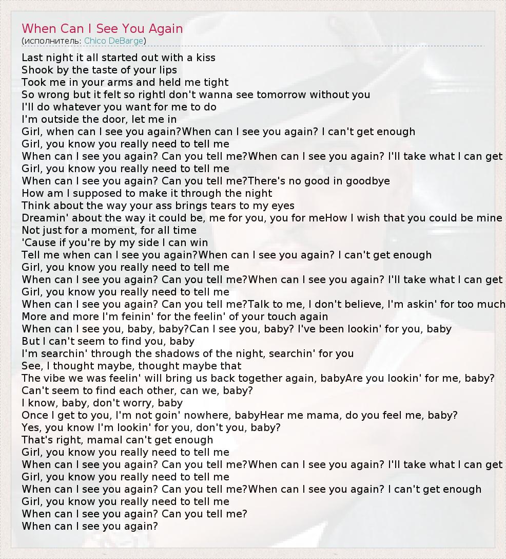 Last night it all started out with a kiss Shook by the taste of your lips Took me in your arms and held me tight So wrong but it felt so rightI don't wanna see tomorrow without you I'll do whatever you want for me to do I'm outside the door, let me in Girl, when can I see you again?When can I see you again? I can't get enough Girl, you know you really need to tell me When can I see you again? Can you tell me?When can I see you again? I'll take what I can get Girl, you know you really need to tell me When can I see you again? Can you tell me?There's no good in goodbye How am I supposed to make it through the night Think about the way your ass brings tears to my eyes Dreamin' about the way it could be, me for you, you for meHow I wish that you could be mine Not just for a moment, for all time 'Cause if you're by my side I can win Tell me when can I see you again?When can I see you again? I can't get enough Girl, you know you really need to tell me When can I see you again? Can you tell me?When can I see you again? I'll take what I can get Girl, you know you really need to tell me When can I see you again? Can you tell me?Talk to me, I don't believe, I'm askin' for too much More and more I'm feinin' for the feelin' of your touch again When can I see you, baby, baby?Can I see you, baby? I've been lookin' for you, baby But I can't seem to find you, baby I'm searchin' through the shadows of the night, searchin' for you See, I thought maybe, thought maybe that The vibe we was feelin' will bring us back together again, babyAre you lookin' for me, baby? Can't seem to find each other, can we, baby? I know, baby, don't worry, baby Once I get to you, I'm not goin' nowhere, babyHear me mama, do you feel me, baby? Yes, you know I'm lookin' for you, don't you, baby? That's right, mamaI can't get enough Girl, you know you really need to tell me When can I see you again? Can you tell me?When can I see you again? I'll take what I can get Girl, you know you really need to tell me When can I see you again? Can you tell me?When can I see you again? I can't get enough Girl, you know you really need to tell me When can I see you again? Can you tell me? When can I see you again?