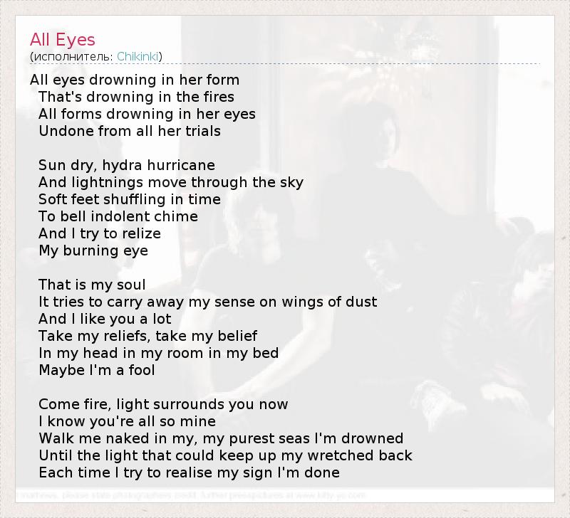 All eyes drowning in her form That's drowning in the fires All forms drowning in her eyes Undone from all her trials Sun dry, hydra hurricane And lightnings move through the sky Soft feet shuffling in time To bell indolent chime And I try to relize My burning eye That is my soul It tries to carry away my sense on wings of dust And I like you a lot Take my reliefs, take my belief In my head in my room in my bed Maybe I'm a fool Come fire, light surrounds you now I know you're all so mine Walk me naked in my, my purest seas I'm drowned Until the light that could keep up my wretched back Each time I try to realise my sign I'm done