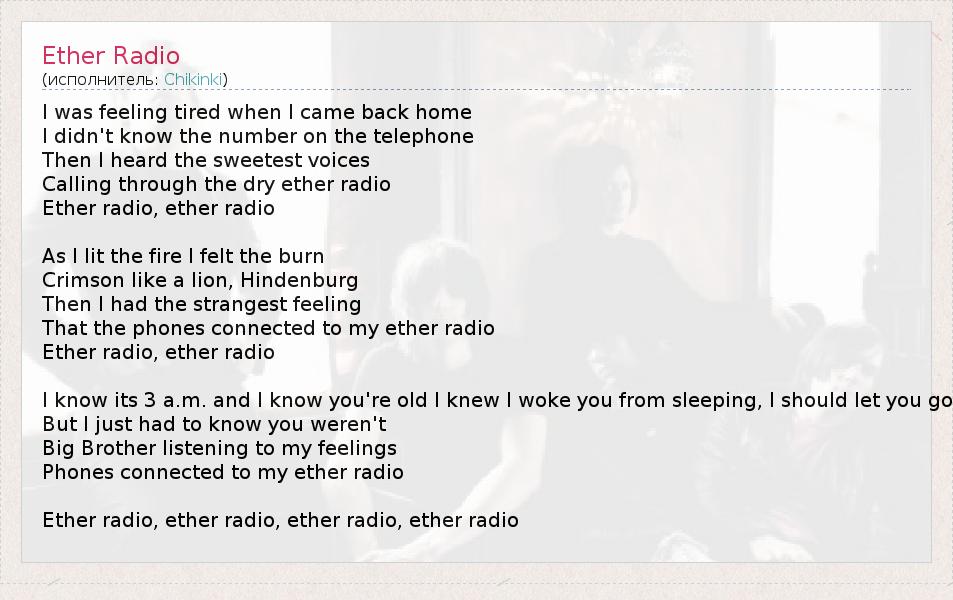 I was feeling tired when I came back home I didn't know the number on the telephone Then I heard the sweetest voices Calling through the dry ether radio Ether radio, ether radio As I lit the fire I felt the burn Crimson like a lion, Hindenburg Then I had the strangest feeling That the phones connected to my ether radio Ether radio, ether radio I know its 3 a.m. and I know you're old I knew I woke you from sleeping, I should let you go But I just had to know you weren't Big Brother listening to my feelings Phones connected to my ether radio Ether radio, ether radio, ether radio, ether radio
