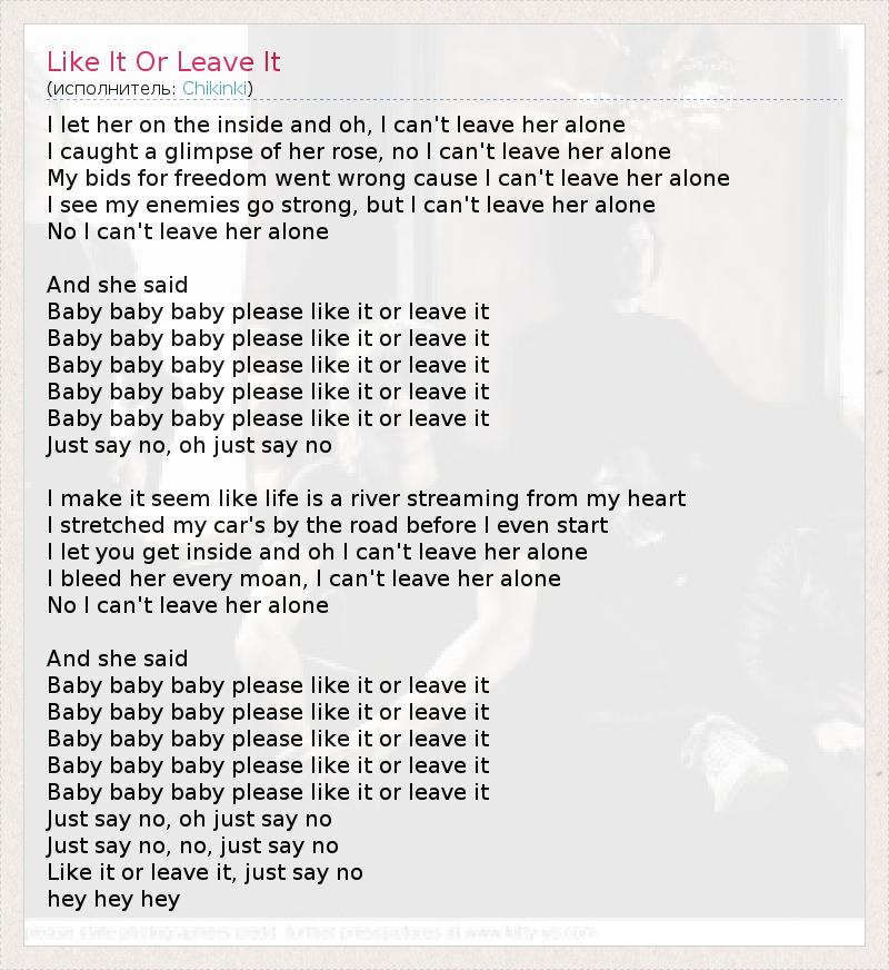 I let her on the inside and oh, I can't leave her alone I caught a glimpse of her rose, no I can't leave her alone My bids for freedom went wrong cause I can't leave her alone I see my enemies go strong, but I can't leave her alone No I can't leave her alone And she said Baby baby baby please like it or leave it Baby baby baby please like it or leave it Baby baby baby please like it or leave it Baby baby baby please like it or leave it Baby baby baby please like it or leave it Just say no, oh just say no I make it seem like life is a river streaming from my heart I stretched my car's by the road before I even start I let you get inside and oh I can't leave her alone I bleed her every moan, I can't leave her alone No I can't leave her alone And she said Baby baby baby please like it or leave it Baby baby baby please like it or leave it Baby baby baby please like it or leave it Baby baby baby please like it or leave it Baby baby baby please like it or leave it Just say no, oh just say no Just say no, no, just say no Like it or leave it, just say no hey hey hey