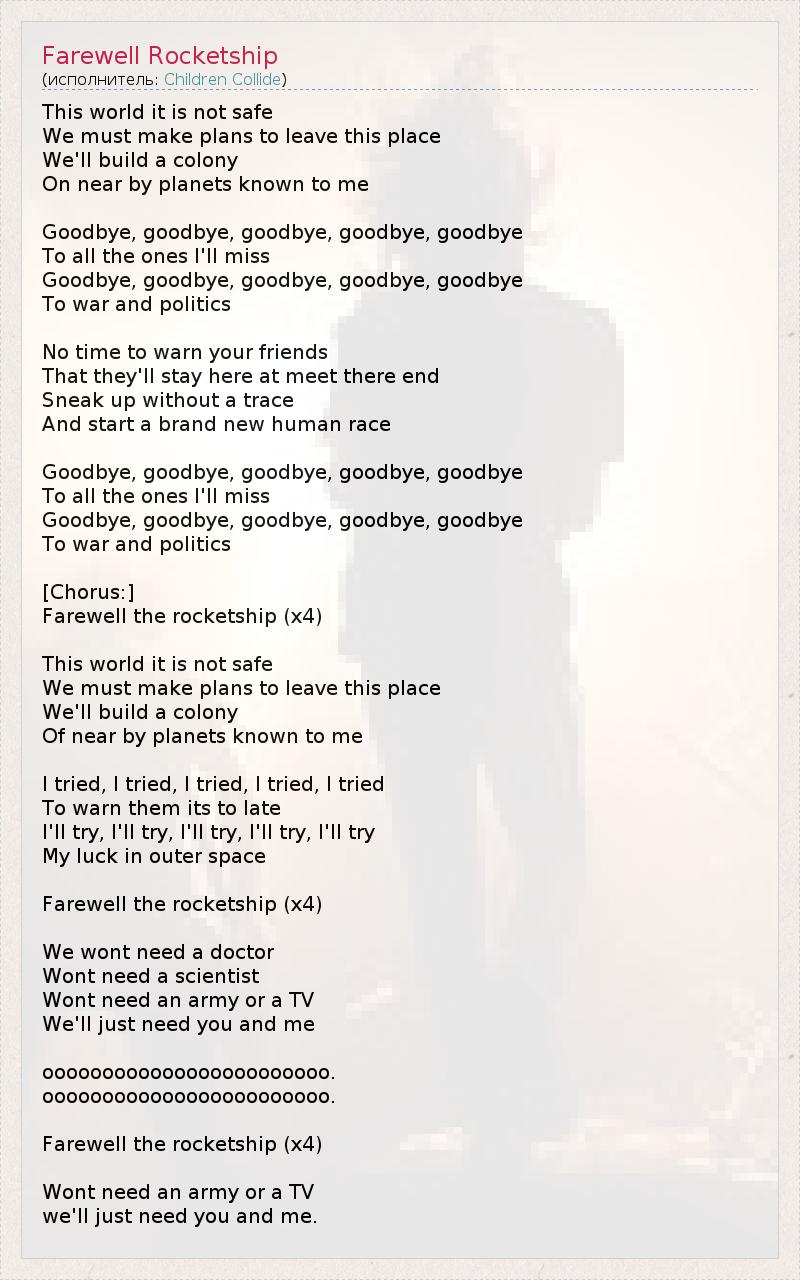 This world it is not safe We must make plans to leave this place We'll build a colony On near by planets known to me Goodbye, goodbye, goodbye, goodbye, goodbye To all the ones I'll miss Goodbye, goodbye, goodbye, goodbye, goodbye To war and politics No time to warn your friends That they'll stay here at meet there end Sneak up without a trace And start a brand new human race Goodbye, goodbye, goodbye, goodbye, goodbye To all the ones I'll miss Goodbye, goodbye, goodbye, goodbye, goodbye To war and politics [Chorus:] Farewell the rocketship (x4) This world it is not safe We must make plans to leave this place We'll build a colony Of near by planets known to me I tried, I tried, I tried, I tried, I tried To warn them its to late I'll try, I'll try, I'll try, I'll try, I'll try My luck in outer space Farewell the rocketship (x4) We wont need a doctor Wont need a scientist Wont need an army or a TV We'll just need you and me oooooooooooooooooooooooo. oooooooooooooooooooooooo. Farewell the rocketship (x4) Wont need an army or a TV we'll just need you and me.