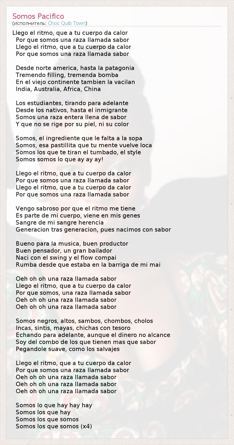 Llego el ritmo, que a tu cuerpo da calor Por que somos una raza llamada sabor Llego el ritmo, que a tu cuerpo da calor Por que somos una raza llamada sabor Desde norte america, hasta la patagonia Tremendo filling, tremenda bomba En el viejo continente tambien la vacilan India, Australia, Africa, China Los estudiantes, tirando para adelante Desde los nativos, hasta el inmigrante Somos una raza entera llena de sabor Y que no se rige por su piel, ni su color Somos, el ingrediente que le falta a la sopa Somos, esa pastillita que tu mente vuelve loca Somos los que te tiran el tumbado, el style Somos somos lo que ay ay ay! Llego el ritmo, que a tu cuerpo da calor Por que somos una raza llamada sabor Llego el ritmo, que a tu cuerpo da calor Por que somos una raza llamada sabor Vengo sabroso por que el ritmo me tiene Es parte de mi cuerpo, viene en mis genes Sangre de mi sangre herencia Generacion tras generacion, pues nacimos con sabor Bueno para la musica, buen productor Buen pensador, un gran bailador Naci con el swing y el flow compai Rumba desde que estaba en la barriga de mi mai Oeh oh oh una raza llamada sabor Llego el ritmo, que a tu cuerpo da calor Por que somos, una raza llamada sabor Oeh oh oh una raza llamada sabor Oeh oh oh una raza llamada sabor Somos negros, altos, sambos, chombos, cholos Incas, sintis, mayas, chichas con tesoro Echando para adelante, aunque el dinero no alcance Soy del combo de los que tienen mas que sabor Pegandole suave, como los salvajes Llego el ritmo, que a tu cuerpo da calor Por que somos una raza llamada sabor Oeh oh oh una raza llamada sabor Oeh oh oh una raza llamada sabor Oeh oh oh una raza llamada sabor Somos lo que hay hay hay Somos los que hay Somos los que somos Somos los que somos (x4)