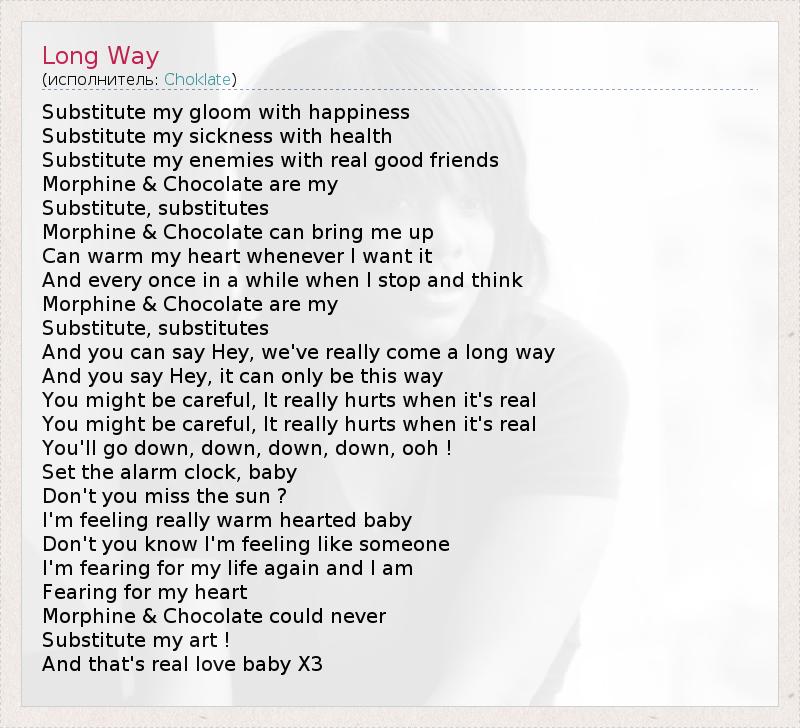 Substitute my gloom with happiness Substitute my sickness with health Substitute my enemies with real good friends Morphine & Chocolate are my Substitute, substitutes Morphine & Chocolate can bring me up Can warm my heart whenever I want it And every once in a while when I stop and think Morphine & Chocolate are my Substitute, substitutes And you can say Hey, we've really come a long way And you say Hey, it can only be this way You might be careful, It really hurts when it's real You might be careful, It really hurts when it's real You'll go down, down, down, down, ooh ! Set the alarm clock, baby Don't you miss the sun ? I'm feeling really warm hearted baby Don't you know I'm feeling like someone I'm fearing for my life again and I am Fearing for my heart Morphine & Chocolate could never Substitute my art ! And that's real love baby X3