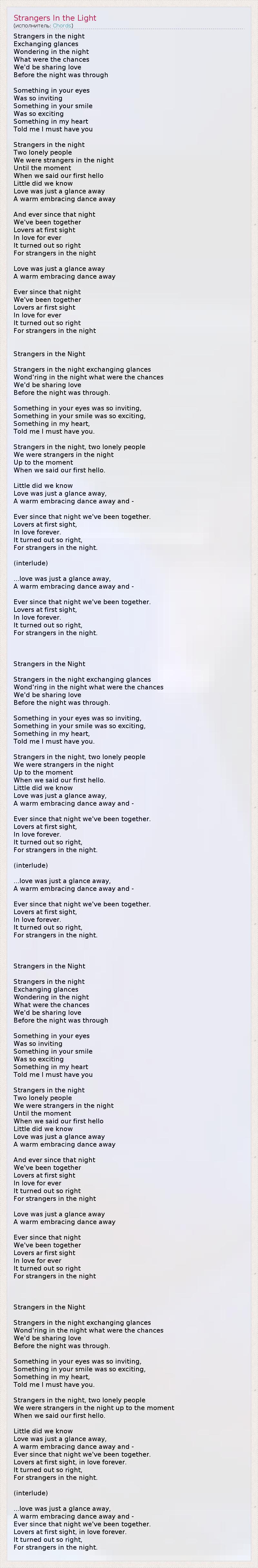 Strangers in the night Exchanging glances Wondering in the night What were the chances We'd be sharing love Before the night was through Something in your eyes Was so inviting Something in your smile Was so exciting Something in my heart Told me I must have you Strangers in the night Two lonely people We were strangers in the night Until the moment When we said our first hello Little did we know Love was just a glance away A warm embracing dance away And ever since that night We've been together Lovers at first sight In love for ever It turned out so right For strangers in the night Love was just a glance away A warm embracing dance away Ever since that night We've been together Lovers ar first sight In love for ever It turned out so right For strangers in the night Strangers in the Night Strangers in the night exchanging glances Wond'ring in the night what were the chances We'd be sharing love Before the night was through. Something in your eyes was so inviting, Something in your smile was so exciting, Something in my heart, Told me I must have you. Strangers in the night, two lonely people We were strangers in the night Up to the moment When we said our first hello. Little did we know Love was just a glance away, A warm embracing dance away and - Ever since that night we've been together. Lovers at first sight, In love forever. It turned out so right, For strangers in the night. (interlude) ...love was just a glance away, A warm embracing dance away and - Ever since that night we've been together. Lovers at first sight, In love forever. It turned out so right, For strangers in the night. Strangers in the Night Strangers in the night exchanging glances Wond'ring in the night what were the chances We'd be sharing love Before the night was through. Something in your eyes was so inviting, Something in your smile was so exciting, Something in my heart, Told me I must have you. Strangers in the night, two lonely people We were strangers in the night Up to the moment When we said our first hello. Little did we know Love was just a glance away, A warm embracing dance away and - Ever since that night we've been together. Lovers at first sight, In love forever. It turned out so right, For strangers in the night. (interlude) ...love was just a glance away, A warm embracing dance away and - Ever since that night we've been together. Lovers at first sight, In love forever. It turned out so right, For strangers in the night. Strangers in the Night Strangers in the night Exchanging glances Wondering in the night What were the chances We'd be sharing love Before the night was through Something in your eyes Was so inviting Something in your smile Was so exciting Something in my heart Told me I must have you Strangers in the night Two lonely people We were strangers in the night Until the moment When we said our first hello Little did we know Love was just a glance away A warm embracing dance away And ever since that night We've been together Lovers at first sight In love for ever It turned out so right For strangers in the night Love was just a glance away A warm embracing dance away Ever since that night We've been together Lovers ar first sight In love for ever It turned out so right For strangers in the night Strangers in the Night Strangers in the night exchanging glances Wond'ring in the night what were the chances We'd be sharing love Before the night was through. Something in your eyes was so inviting, Something in your smile was so exciting, Something in my heart, Told me I must have you. Strangers in the night, two lonely people We were strangers in the night up to the moment When we said our first hello. Little did we know Love was just a glance away, A warm embracing dance away and - Ever since that night we've been together. Lovers at first sight, in love forever. It turned out so right, For strangers in the night. (interlude) ...love was just a glance away, A warm embracing dance away and - Ever since that night we've been together. Lovers at first sight, in love forever. It turned out so right, For strangers in the night.