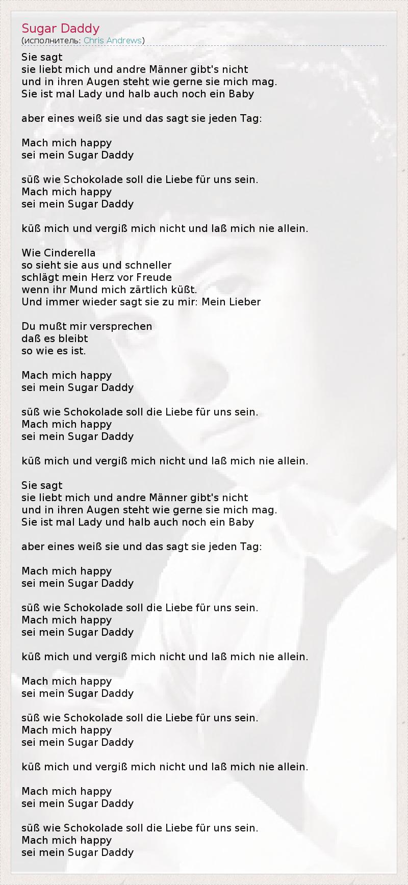 Sie sagt sie liebt mich und andre Männer gibt's nicht und in ihren Augen steht wie gerne sie mich mag. Sie ist mal Lady und halb auch noch ein Baby aber eines weiß sie und das sagt sie jeden Tag: Mach mich happy sei mein Sugar Daddy süß wie Schokolade soll die Liebe für uns sein. Mach mich happy sei mein Sugar Daddy küß mich und vergiß mich nicht und laß mich nie allein. Wie Cinderella so sieht sie aus und schneller schlägt mein Herz vor Freude wenn ihr Mund mich zärtlich küßt. Und immer wieder sagt sie zu mir: Mein Lieber Du mußt mir versprechen daß es bleibt so wie es ist. Mach mich happy sei mein Sugar Daddy süß wie Schokolade soll die Liebe für uns sein. Mach mich happy sei mein Sugar Daddy küß mich und vergiß mich nicht und laß mich nie allein. Sie sagt sie liebt mich und andre Männer gibt's nicht und in ihren Augen steht wie gerne sie mich mag. Sie ist mal Lady und halb auch noch ein Baby aber eines weiß sie und das sagt sie jeden Tag: Mach mich happy sei mein Sugar Daddy süß wie Schokolade soll die Liebe für uns sein. Mach mich happy sei mein Sugar Daddy küß mich und vergiß mich nicht und laß mich nie allein. Mach mich happy sei mein Sugar Daddy süß wie Schokolade soll die Liebe für uns sein. Mach mich happy sei mein Sugar Daddy küß mich und vergiß mich nicht und laß mich nie allein. Mach mich happy sei mein Sugar Daddy süß wie Schokolade soll die Liebe für uns sein. Mach mich happy sei mein Sugar Daddy