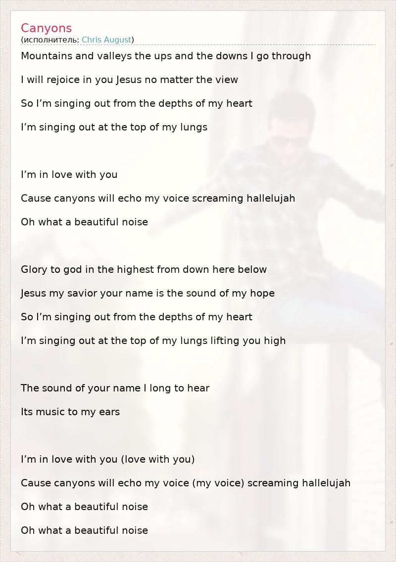 Mountains and valleys the ups and the downs I go through I will rejoice in you Jesus no matter the view So I’m singing out from the depths of my heart I’m singing out at the top of my lungs I’m in love with you Cause canyons will echo my voice screaming hallelujah Oh what a beautiful noise Glory to god in the highest from down here below Jesus my savior your name is the sound of my hope So I’m singing out from the depths of my heart I’m singing out at the top of my lungs lifting you high The sound of your name I long to hear Its music to my ears I’m in love with you (love with you) Cause canyons will echo my voice (my voice) screaming hallelujah Oh what a beautiful noise Oh what a beautiful noise