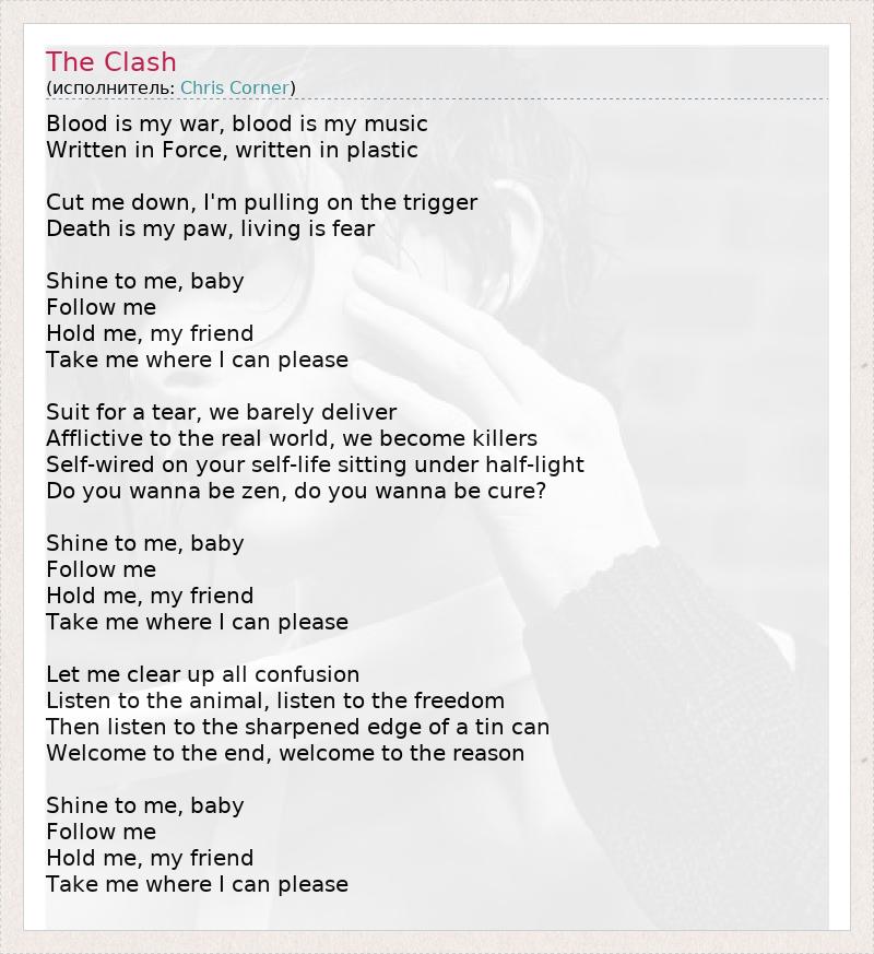 Blood is my war, blood is my music Written in Force, written in plastic Cut me down, I'm pulling on the trigger Death is my paw, living is fear Shine to me, baby Follow me Hold me, my friend Take me where I can please Suit for a tear, we barely deliver Afflictive to the real world, we become killers Self-wired on your self-life sitting under half-light Do you wanna be zen, do you wanna be cure? Shine to me, baby Follow me Hold me, my friend Take me where I can please Let me clear up all confusion Listen to the animal, listen to the freedom Then listen to the sharpened edge of a tin can Welcome to the end, welcome to the reason Shine to me, baby Follow me Hold me, my friend Take me where I can please