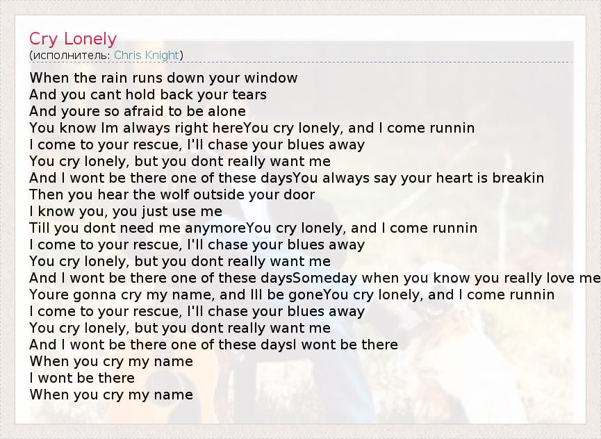 When the rain runs down your window And you cant hold back your tears And youre so afraid to be alone You know Im always right hereYou cry lonely, and I come runnin I come to your rescue, I'll chase your blues away You cry lonely, but you dont really want me And I wont be there one of these daysYou always say your heart is breakin Then you hear the wolf outside your door I know you, you just use me Till you dont need me anymoreYou cry lonely, and I come runnin I come to your rescue, I'll chase your blues away You cry lonely, but you dont really want me And I wont be there one of these daysSomeday when you know you really love me Youre gonna cry my name, and Ill be goneYou cry lonely, and I come runnin I come to your rescue, I'll chase your blues away You cry lonely, but you dont really want me And I wont be there one of these daysI wont be there When you cry my name I wont be there When you cry my name