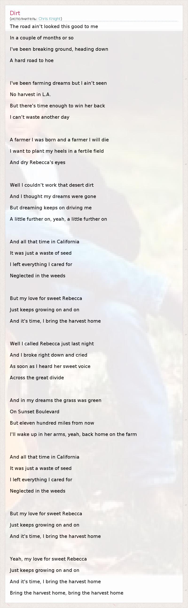 The road ain't looked this good to me In a couple of months or so I've been breaking ground, heading down A hard road to hoe I've been farming dreams but I ain't seen No harvest in L.A. But there's time enough to win her back I can't waste another day A farmer I was born and a farmer I will die I want to plant my heels in a fertile field And dry Rebecca's eyes Well I couldn't work that desert dirt And I thought my dreams were gone But dreaming keeps on driving me A little further on, yeah, a little further on And all that time in California It was just a waste of seed I left everything I cared for Neglected in the weeds But my love for sweet Rebecca Just keeps growing on and on And it's time, I bring the harvest home Well I called Rebecca just last night And I broke right down and cried As soon as I heard her sweet voice Across the great divide And in my dreams the grass was green On Sunset Boulevard But eleven hundred miles from now I'll wake up in her arms, yeah, back home on the farm And all that time in California It was just a waste of seed I left everything I cared for Neglected in the weeds But my love for sweet Rebecca Just keeps growing on and on And it's time, I bring the harvest home Yeah, my love for sweet Rebecca Just keeps growing on and on And it's time, I bring the harvest home Bring the harvest home, bring the harvest home