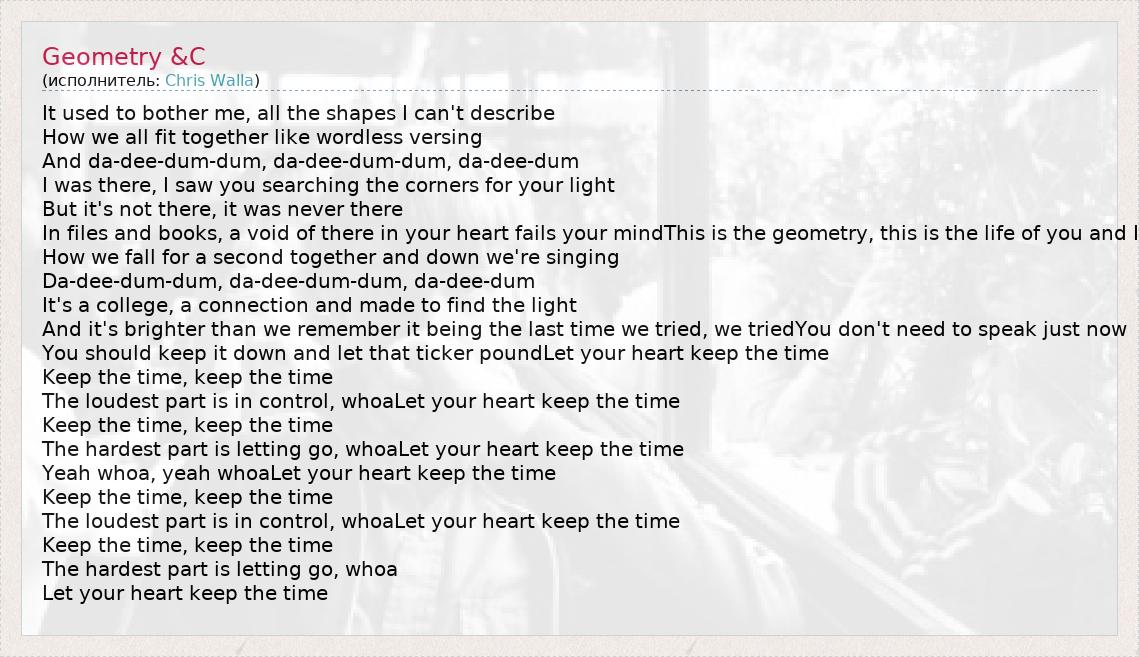 It used to bother me, all the shapes I can't describe How we all fit together like wordless versing And da-dee-dum-dum, da-dee-dum-dum, da-dee-dum I was there, I saw you searching the corners for your light But it's not there, it was never there In files and books, a void of there in your heart fails your mindThis is the geometry, this is the life of you and I How we fall for a second together and down we're singing Da-dee-dum-dum, da-dee-dum-dum, da-dee-dum It's a college, a connection and made to find the light And it's brighter than we remember it being the last time we tried, we triedYou don't need to speak just now You should keep it down and let that ticker poundLet your heart keep the time Keep the time, keep the time The loudest part is in control, whoaLet your heart keep the time Keep the time, keep the time The hardest part is letting go, whoaLet your heart keep the time Yeah whoa, yeah whoaLet your heart keep the time Keep the time, keep the time The loudest part is in control, whoaLet your heart keep the time Keep the time, keep the time The hardest part is letting go, whoa Let your heart keep the time