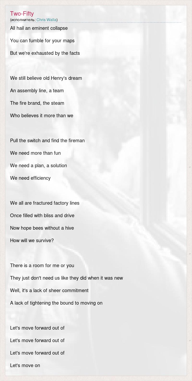 All hail an eminent collapse You can fumble for your maps But we're exhausted by the facts We still believe old Henry's dream An assembly line, a team The fire brand, the steam Who believes it more than we Pull the switch and find the fireman We need more than fun We need a plan, a solution We need efficiency We all are fractured factory lines Once filled with bliss and drive Now hope bees without a hive How will we survive? There is a room for me or you They just don't need us like they did when it was new Well, it's a lack of sheer commitment A lack of tightening the bound to moving on Let's move forward out of Let's move forward out of Let's move forward out of Let's move on