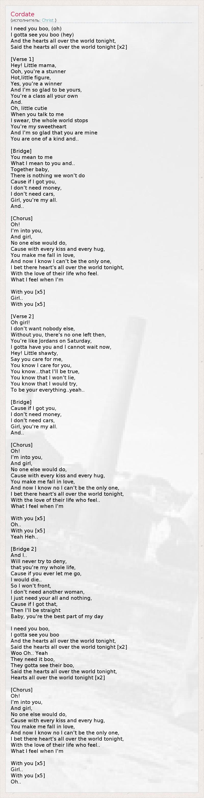 I need you boo, (oh) I gotta see you boo (hey) And the hearts all over the world tonight, Said the hearts all over the world tonight [x2] [Verse 1] Hey! Little mama, Ooh, you're a stunner Hot,little figure, Yes, you're a winner And I'm so glad to be yours, You're a class all your own And. Oh, little cutie When you talk to me I swear, the whole world stops You're my sweetheart And I'm so glad that you are mine You are one of a kind and.. [Bridge] You mean to me What I mean to you and.. Together baby, There is nothing we won't do Cause if I got you, I don't need money, I don't need cars, Girl, you're my all. And.. [Chorus] Oh! I'm into you, And girl, No one else would do, Cause with every kiss and every hug, You make me fall in love, And now I know I can't be the only one, I bet there heart's all over the world tonight, With the love of their life who feel. What I feel when I'm With you [x5] Girl.. With you [x5] [Verse 2] Oh girl! I don't want nobody else, Without you, there's no one left then, You're like Jordans on Saturday, I gotta have you and I cannot wait now, Hey! Little shawty, Say you care for me, You know I care for you, You know...that I'll be true, You know that I won't lie, You know that I would try, To be your everything..yeah.. [Bridge] Cause if I got you, I don't need money, I don't need cars, Girl, you're my all. And.. [Chorus] Oh! I'm into you, And girl, No one else would do, Cause with every kiss and every hug, You make me fall in love, And now I know no I can't be the only one, I bet there heart's all over the world tonight, With the love of their life who feel.. What I feel when I'm With you [x5] Oh.. With you [x5] Yeah Heh.. [Bridge 2] And I.. Will never try to deny, that you're my whole life, Cause if you ever let me go, I would die.. So I won't front, I don't need another woman, I just need your all and nothing, Cause if I got that, Then I'll be straight Baby, you're the best part of my day I need you boo, I gotta see you boo And the hearts all over the world tonight, Said the hearts all over the world tonight [x2] Woo Oh.. Yeah They need it boo, They gotta see their boo, Said the hearts all over the world tonight, Hearts all over the world tonight [x2] [Chorus] Oh! I'm into you, And girl, No one else would do, Cause with every kiss and every hug, You make me fall in love, And now I know no I can't be the only one, I bet there heart's all over the world tonight, With the love of their life who feel.. What I feel when I'm With you [x5] Girl.. With you [x5] Oh..