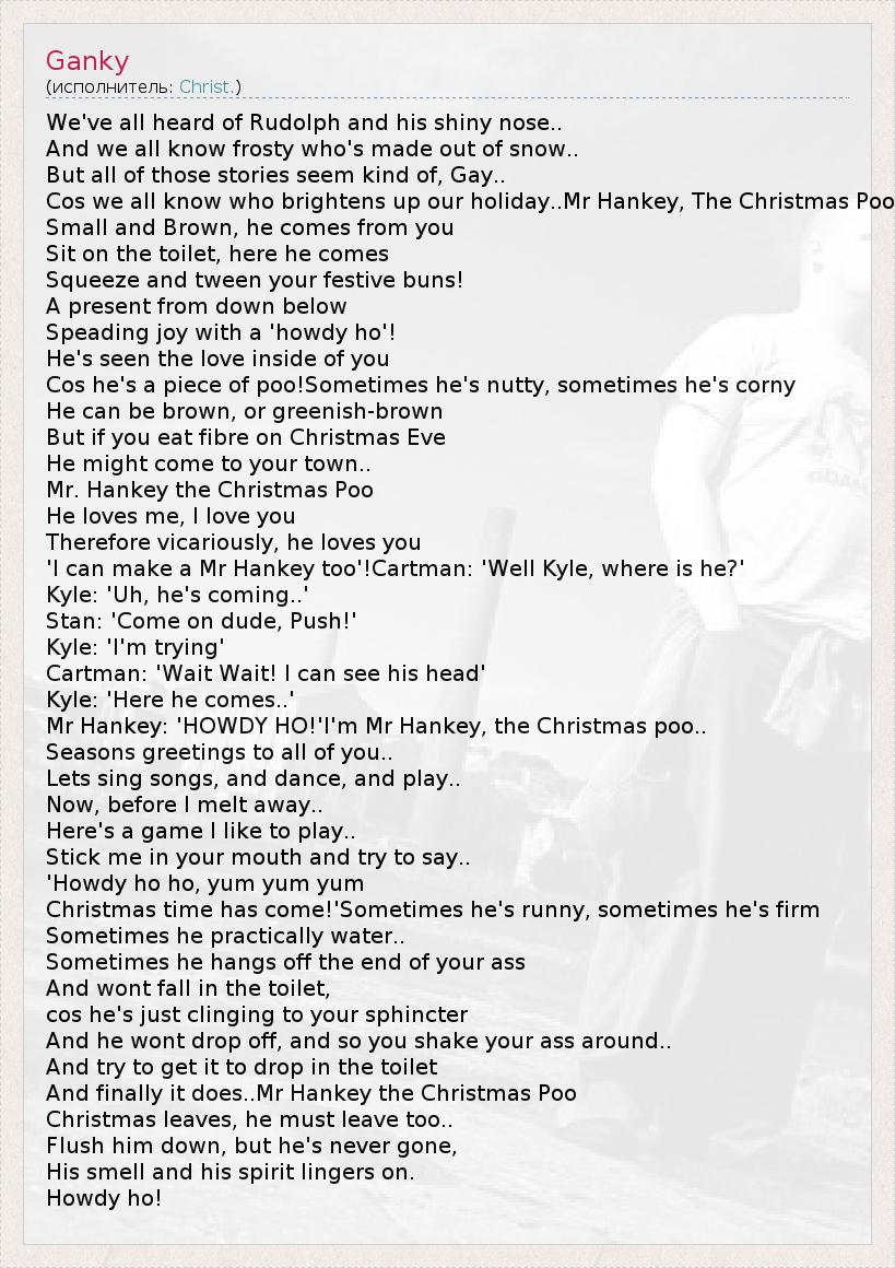 We've all heard of Rudolph and his shiny nose.. And we all know frosty who's made out of snow.. But all of those stories seem kind of, Gay.. Cos we all know who brightens up our holiday..Mr Hankey, The Christmas Poo Small and Brown, he comes from you Sit on the toilet, here he comes Squeeze and tween your festive buns! A present from down below Speading joy with a 'howdy ho'! He's seen the love inside of you Cos he's a piece of poo!Sometimes he's nutty, sometimes he's corny He can be brown, or greenish-brown But if you eat fibre on Christmas Eve He might come to your town.. Mr. Hankey the Christmas Poo He loves me, I love you Therefore vicariously, he loves you 'I can make a Mr Hankey too'!Cartman: 'Well Kyle, where is he?' Kyle: 'Uh, he's coming..' Stan: 'Come on dude, Push!' Kyle: 'I'm trying' Cartman: 'Wait Wait! I can see his head' Kyle: 'Here he comes..' Mr Hankey: 'HOWDY HO!'I'm Mr Hankey, the Christmas poo.. Seasons greetings to all of you.. Lets sing songs, and dance, and play.. Now, before I melt away.. Here's a game I like to play.. Stick me in your mouth and try to say.. 'Howdy ho ho, yum yum yum Christmas time has come!'Sometimes he's runny, sometimes he's firm Sometimes he practically water.. Sometimes he hangs off the end of your ass And wont fall in the toilet, cos he's just clinging to your sphincter And he wont drop off, and so you shake your ass around.. And try to get it to drop in the toilet And finally it does..Mr Hankey the Christmas Poo Christmas leaves, he must leave too.. Flush him down, but he's never gone, His smell and his spirit lingers on. Howdy ho!