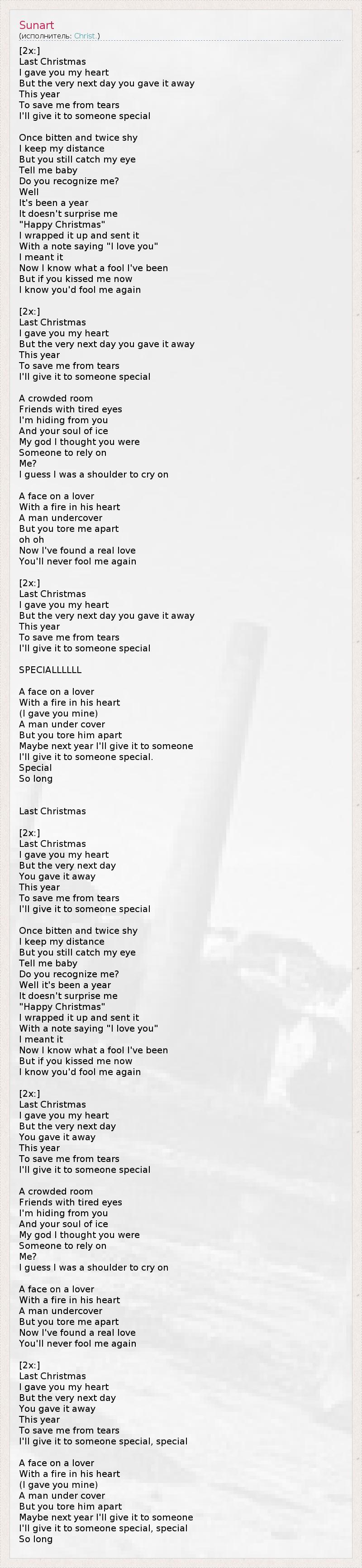[2x:] Last Christmas I gave you my heart But the very next day you gave it away This year To save me from tears I'll give it to someone special Once bitten and twice shy I keep my distance But you still catch my eye Tell me baby Do you recognize me? Well It's been a year It doesn't surprise me "Happy Christmas" I wrapped it up and sent it With a note saying "I love you" I meant it Now I know what a fool I've been But if you kissed me now I know you'd fool me again [2x:] Last Christmas I gave you my heart But the very next day you gave it away This year To save me from tears I'll give it to someone special A crowded room Friends with tired eyes I'm hiding from you And your soul of ice My god I thought you were Someone to rely on Me? I guess I was a shoulder to cry on A face on a lover With a fire in his heart A man undercover But you tore me apart oh oh Now I've found a real love You'll never fool me again [2x:] Last Christmas I gave you my heart But the very next day you gave it away This year To save me from tears I'll give it to someone special SPECIALLLLLL A face on a lover With a fire in his heart (I gave you mine) A man under cover But you tore him apart Maybe next year I'll give it to someone I'll give it to someone special. Special So long Last Christmas [2x:] Last Christmas I gave you my heart But the very next day You gave it away This year To save me from tears I'll give it to someone special Once bitten and twice shy I keep my distance But you still catch my eye Tell me baby Do you recognize me? Well it's been a year It doesn't surprise me "Happy Christmas" I wrapped it up and sent it With a note saying "I love you" I meant it Now I know what a fool I've been But if you kissed me now I know you'd fool me again [2x:] Last Christmas I gave you my heart But the very next day You gave it away This year To save me from tears I'll give it to someone special A crowded room Friends with tired eyes I'm hiding from you And your soul of ice My god I thought you were Someone to rely on Me? I guess I was a shoulder to cry on A face on a lover With a fire in his heart A man undercover But you tore me apart Now I've found a real love You'll never fool me again [2x:] Last Christmas I gave you my heart But the very next day You gave it away This year To save me from tears I'll give it to someone special, special A face on a lover With a fire in his heart (I gave you mine) A man under cover But you tore him apart Maybe next year I'll give it to someone I'll give it to someone special, special So long