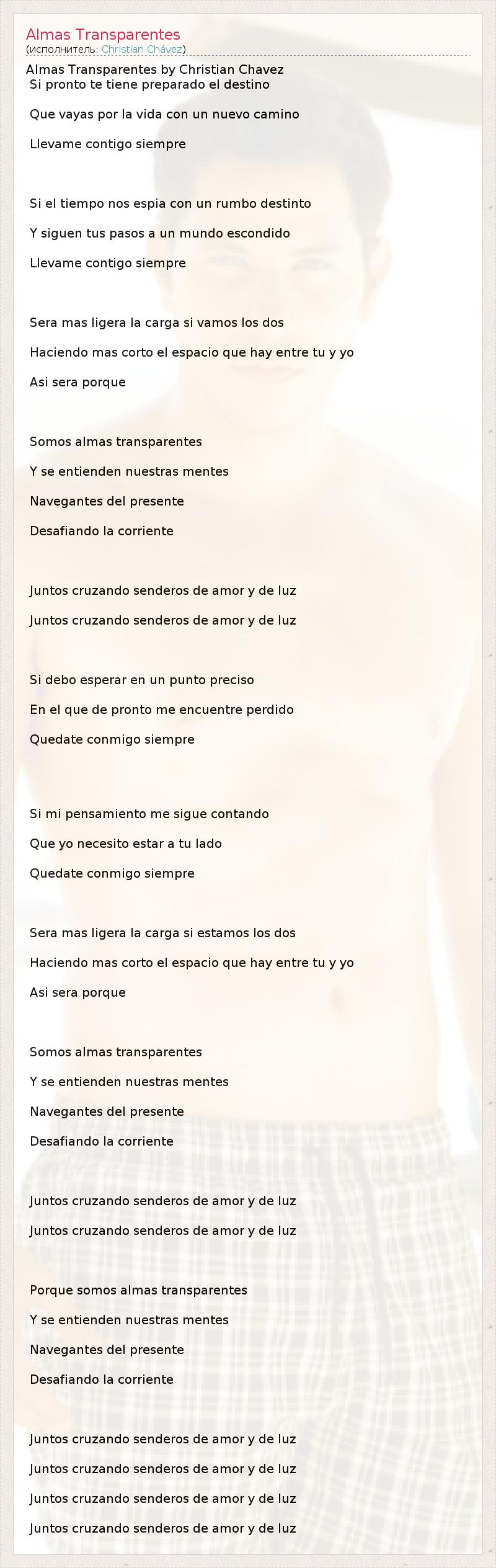 Almas Transparentes by Christian Chavez Si pronto te tiene preparado el destino Que vayas por la vida con un nuevo camino Llevame contigo siempre Si el tiempo nos espia con un rumbo destinto Y siguen tus pasos a un mundo escondido Llevame contigo siempre Sera mas ligera la carga si vamos los dos Haciendo mas corto el espacio que hay entre tu y yo Asi sera porque Somos almas transparentes Y se entienden nuestras mentes Navegantes del presente Desafiando la corriente Juntos cruzando senderos de amor y de luz Juntos cruzando senderos de amor y de luz Si debo esperar en un punto preciso En el que de pronto me encuentre perdido Quedate conmigo siempre Si mi pensamiento me sigue contando Que yo necesito estar a tu lado Quedate conmigo siempre Sera mas ligera la carga si estamos los dos Haciendo mas corto el espacio que hay entre tu y yo Asi sera porque Somos almas transparentes Y se entienden nuestras mentes Navegantes del presente Desafiando la corriente Juntos cruzando senderos de amor y de luz Juntos cruzando senderos de amor y de luz Porque somos almas transparentes Y se entienden nuestras mentes Navegantes del presente Desafiando la corriente Juntos cruzando senderos de amor y de luz Juntos cruzando senderos de amor y de luz Juntos cruzando senderos de amor y de luz Juntos cruzando senderos de amor y de luz
