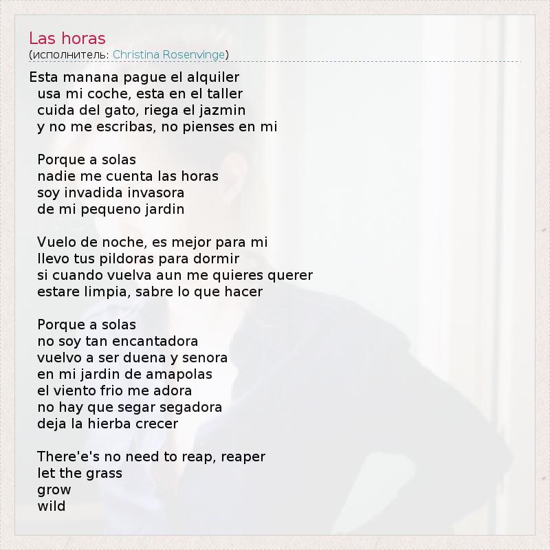 Esta manana pague el alquiler usa mi coche, esta en el taller cuida del gato, riega el jazmin y no me escribas, no pienses en mi Porque a solas nadie me cuenta las horas soy invadida invasora de mi pequeno jardin Vuelo de noche, es mejor para mi llevo tus pildoras para dormir si cuando vuelva aun me quieres querer estare limpia, sabre lo que hacer Porque a solas no soy tan encantadora vuelvo a ser duena y senora en mi jardin de amapolas el viento frio me adora no hay que segar segadora deja la hierba crecer There'e's no need to reap, reaper let the grass grow wild