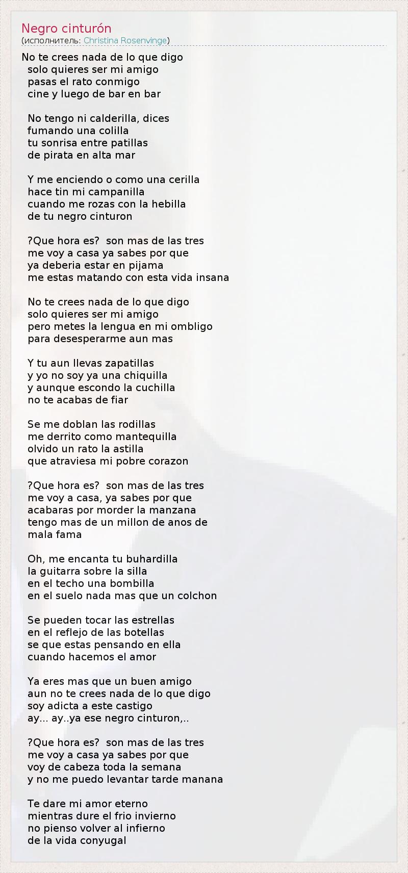 No te crees nada de lo que digo solo quieres ser mi amigo pasas el rato conmigo cine y luego de bar en bar No tengo ni calderilla, dices fumando una colilla tu sonrisa entre patillas de pirata en alta mar Y me enciendo o como una cerilla hace tin mi campanilla cuando me rozas con la hebilla de tu negro cinturon ?Que hora es? son mas de las tres me voy a casa ya sabes por que ya deberia estar en pijama me estas matando con esta vida insana No te crees nada de lo que digo solo quieres ser mi amigo pero metes la lengua en mi ombligo para desesperarme aun mas Y tu aun llevas zapatillas y yo no soy ya una chiquilla y aunque escondo la cuchilla no te acabas de fiar Se me doblan las rodillas me derrito como mantequilla olvido un rato la astilla que atraviesa mi pobre corazon ?Que hora es? son mas de las tres me voy a casa, ya sabes por que acabaras por morder la manzana tengo mas de un millon de anos de mala fama Oh, me encanta tu buhardilla la guitarra sobre la silla en el techo una bombilla en el suelo nada mas que un colchon Se pueden tocar las estrellas en el reflejo de las botellas se que estas pensando en ella cuando hacemos el amor Ya eres mas que un buen amigo aun no te crees nada de lo que digo soy adicta a este castigo ay... ay..ya ese negro cinturon,.. ?Que hora es? son mas de las tres me voy a casa ya sabes por que voy de cabeza toda la semana y no me puedo levantar tarde manana Te dare mi amor eterno mientras dure el frio invierno no pienso volver al infierno de la vida conyugal