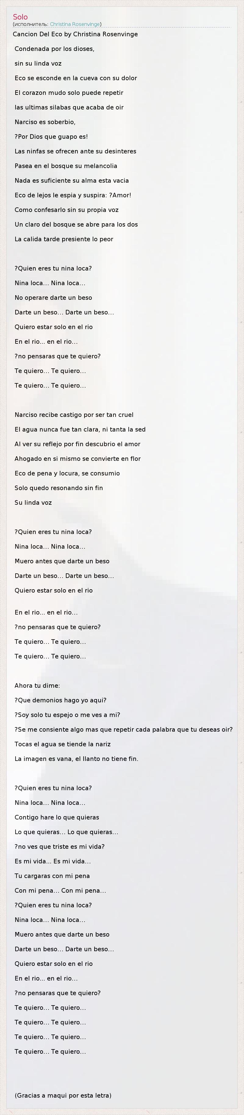 Cancion Del Eco by Christina Rosenvinge Condenada por los dioses, sin su linda voz Eco se esconde en la cueva con su dolor El corazon mudo solo puede repetir las ultimas silabas que acaba de oir Narciso es soberbio, ?Por Dios que guapo es! Las ninfas se ofrecen ante su desinteres Pasea en el bosque su melancolia Nada es suficiente su alma esta vacia Eco de lejos le espia y suspira: ?Amor! Como confesarlo sin su propia voz Un claro del bosque se abre para los dos La calida tarde presiente lo peor ?Quien eres tu nina loca? Nina loca… Nina loca… No operare darte un beso Darte un beso… Darte un beso… Quiero estar solo en el rio En el rio... en el rio… ?no pensaras que te quiero? Te quiero… Te quiero… Te quiero… Te quiero… Narciso recibe castigo por ser tan cruel El agua nunca fue tan clara, ni tanta la sed Al ver su reflejo por fin descubrio el amor Ahogado en si mismo se convierte en flor Eco de pena y locura, se consumio Solo quedo resonando sin fin Su linda voz ?Quien eres tu nina loca? Nina loca… Nina loca… Muero antes que darte un beso Darte un beso… Darte un beso… Quiero estar solo en el rio En el rio... en el rio… ?no pensaras que te quiero? Te quiero… Te quiero… Te quiero… Te quiero… Ahora tu dime: ?Que demonios hago yo aqui? ?Soy solo tu espejo o me ves a mi? ?Se me consiente algo mas que repetir cada palabra que tu deseas oir? Tocas el agua se tiende la nariz La imagen es vana, el llanto no tiene fin. ?Quien eres tu nina loca? Nina loca… Nina loca… Contigo hare lo que quieras Lo que quieras… Lo que quieras… ?no ves que triste es mi vida? Es mi vida... Es mi vida… Tu cargaras con mi pena Con mi pena… Con mi pena… ?Quien eres tu nina loca? Nina loca… Nina loca… Muero antes que darte un beso Darte un beso… Darte un beso… Quiero estar solo en el rio En el rio... en el rio… ?no pensaras que te quiero? Te quiero… Te quiero… Te quiero… Te quiero… Te quiero… Te quiero… Te quiero… Te quiero… (Gracias a maqui por esta letra)