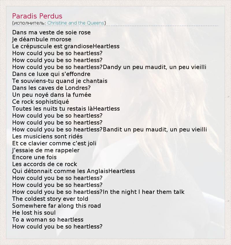 Dans ma veste de soie rose Je déambule morose Le crépuscule est grandioseHeartless How could you be so heartless? How could you be so heartless? How could you be so heartless?Dandy un peu maudit, un peu vieilli Dans ce luxe qui s'effondre Te souviens-tu quand je chantais Dans les caves de Londres? Un peu noyé dans la fumée Ce rock sophistiqué Toutes les nuits tu restais làHeartless How could you be so heartless? How could you be so heartless? How could you be so heartless?Bandit un peu maudit, un peu vieilli Les musiciens sont ridés Et ce clavier comme c'est joli J'essaie de me rappeler Encore une fois Les accords de ce rock Qui détonnait comme les AnglaisHeartless How could you be so heartless? How could you be so heartless? How could you be so heartless?In the night I hear them talk The coldest story ever told Somewhere far along this road He lost his soul To a woman so heartless How could you be so heartless?