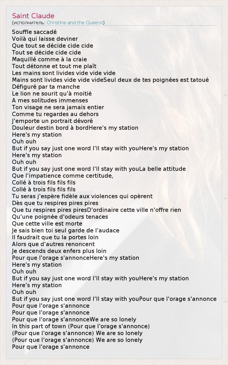 Souffle saccadé Voilà qui laisse deviner Que tout se décide cide cide Tout se décide cide cide Maquillé comme à la craie Tout détonne et tout me plaît Les mains sont livides vide vide vide Mains sont livides vide vide videSeul deux de tes poignées est tatoué Défiguré par ta manche Le lion ne sourit qu'à moitié A mes solitudes immenses Ton visage ne sera jamais entier Comme tu regardes au dehors J'emporte un portrait dévoré Douleur destin bord à bordHere's my station Here's my station Ouh ouh But if you say just one word I'll stay with youHere's my station Here's my station Ouh ouh But if you say just one word I'll stay with youLa belle attitude Que l'impatience comme certitude, Collé à trois fils fils fils Collé à trois fils fils fils Tu seras j'espère fidèle aux violences qui opèrent Dès que tu respires pires pires Que tu respires pires piresD'ordinaire cette ville n'offre rien Qu'une poignée d'odeurs tenaces Que cette ville est morte Je sais bien toi seul garde de l'audace Il faudrait que tu la portes loin Alors que d'autres renoncent Je descends deux enfers plus loin Pour que l'orage s'annonceHere's my station Here's my station Ouh ouh But if you say just one word I'll stay with youHere's my station Here's my station Ouh ouh But if you say just one word I'll stay with youPour que l'orage s'annonce Pour que l'orage s'annonce Pour que l'orage s'annonce Pour que l'orage s'annonceWe are so lonely In this part of town (Pour que l'orage s'annonce) (Pour que l'orage s'annonce) We are so lonely (Pour que l'orage s'annonce) We are so lonely Pour que l'orage s'annonce
