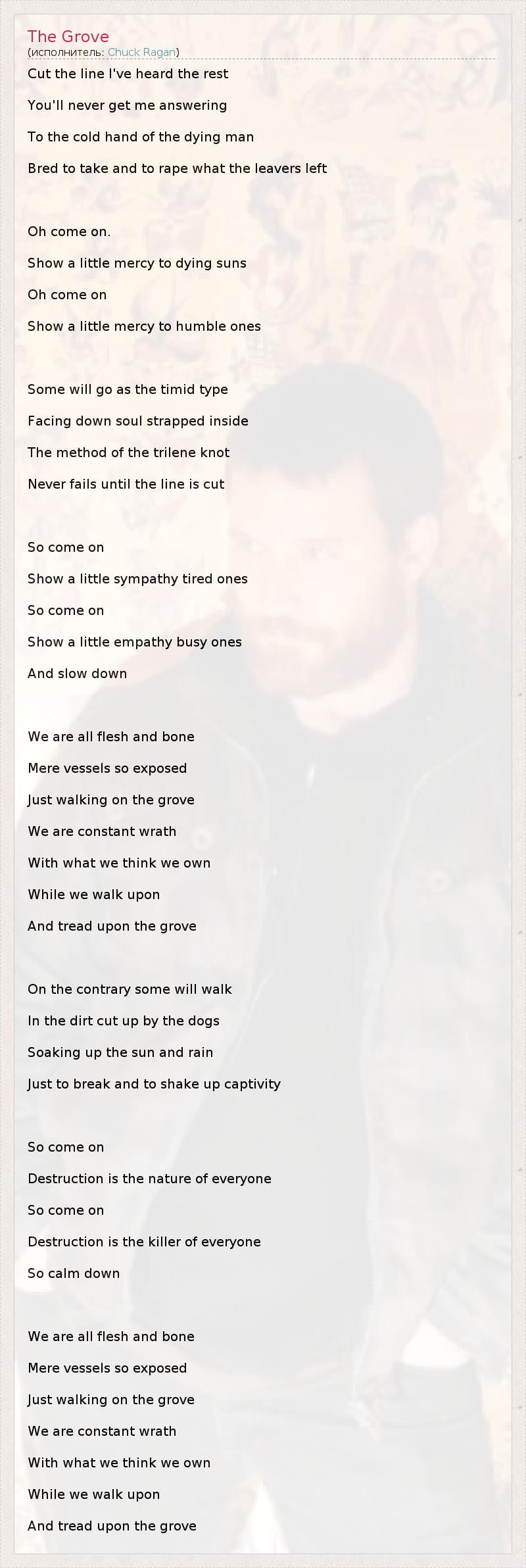 Cut the line I've heard the rest You'll never get me answering To the cold hand of the dying man Bred to take and to rape what the leavers left Oh come on. Show a little mercy to dying suns Oh come on Show a little mercy to humble ones Some will go as the timid type Facing down soul strapped inside The method of the trilene knot Never fails until the line is cut So come on Show a little sympathy tired ones So come on Show a little empathy busy ones And slow down We are all flesh and bone Mere vessels so exposed Just walking on the grove We are constant wrath With what we think we own While we walk upon And tread upon the grove On the contrary some will walk In the dirt cut up by the dogs Soaking up the sun and rain Just to break and to shake up captivity So come on Destruction is the nature of everyone So come on Destruction is the killer of everyone So calm down We are all flesh and bone Mere vessels so exposed Just walking on the grove We are constant wrath With what we think we own While we walk upon And tread upon the grove