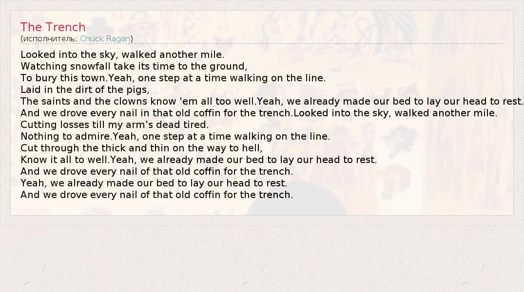 Looked into the sky, walked another mile. Watching snowfall take its time to the ground, To bury this town.Yeah, one step at a time walking on the line. Laid in the dirt of the pigs, The saints and the clowns know 'em all too well.Yeah, we already made our bed to lay our head to rest. And we drove every nail in that old coffin for the trench.Looked into the sky, walked another mile. Cutting losses till my arm's dead tired. Nothing to admire.Yeah, one step at a time walking on the line. Cut through the thick and thin on the way to hell, Know it all to well.Yeah, we already made our bed to lay our head to rest. And we drove every nail of that old coffin for the trench. Yeah, we already made our bed to lay our head to rest. And we drove every nail of that old coffin for the trench.