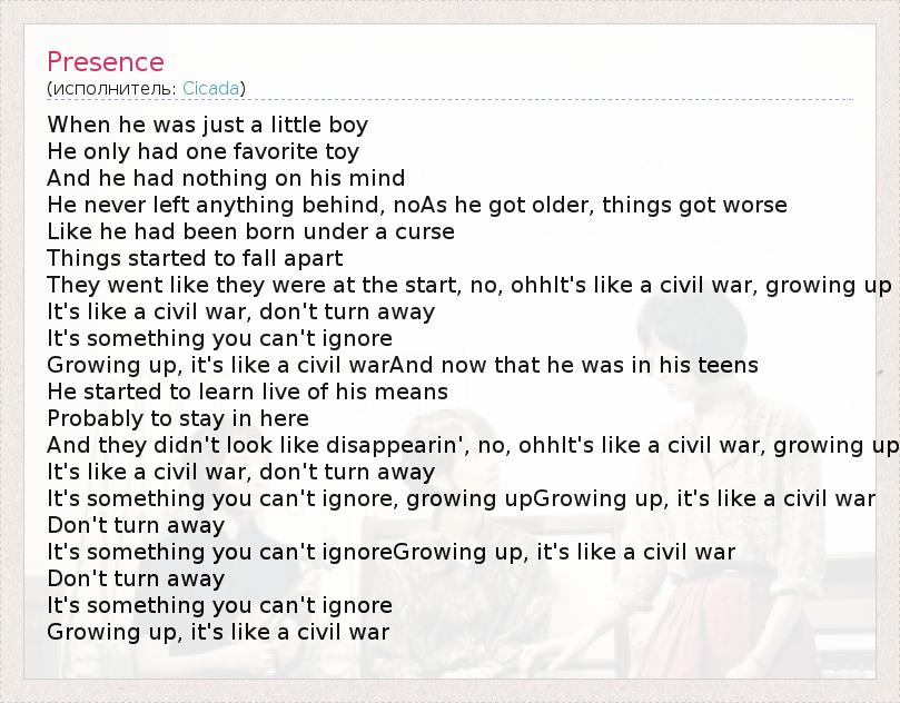When he was just a little boy He only had one favorite toy And he had nothing on his mind He never left anything behind, noAs he got older, things got worse Like he had been born under a curse Things started to fall apart They went like they were at the start, no, ohhIt's like a civil war, growing up It's like a civil war, don't turn away It's something you can't ignore Growing up, it's like a civil warAnd now that he was in his teens He started to learn live of his means Probably to stay in here And they didn't look like disappearin', no, ohhIt's like a civil war, growing up It's like a civil war, don't turn away It's something you can't ignore, growing upGrowing up, it's like a civil war Don't turn away It's something you can't ignoreGrowing up, it's like a civil war Don't turn away It's something you can't ignore Growing up, it's like a civil war