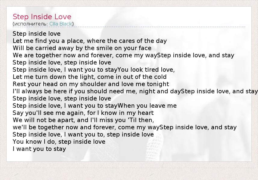 Step inside love Let me find you a place, where the cares of the day Will be carried away by the smile on your face We are together now and forever, come my wayStep inside love, and stay Step inside love, step inside love Step inside love, I want you to stayYou look tired love, Let me turn down the light, come in out of the cold Rest your head on my shoulder and love me tonight I'll always be here if you should need me, night and dayStep inside love, and stay Step inside love, step inside love Step inside love, I want you to stayWhen you leave me Say you'll see me again, for I know in my heart We will not be apart, and I'll miss you 'Til then, we'll be together now and forever, come my wayStep inside love, and stay Step inside love, I want you to, step inside love You know I do, step inside love I want you to stay
