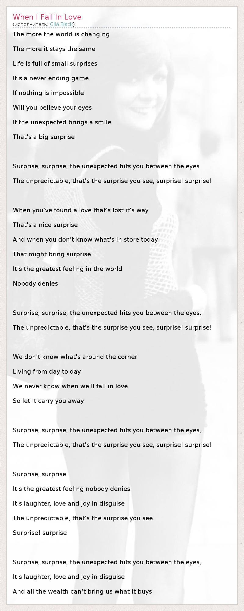 The more the world is changing The more it stays the same Life is full of small surprises It's a never ending game If nothing is impossible Will you believe your eyes If the unexpected brings a smile That's a big surprise Surprise, surprise, the unexpected hits you between the eyes The unpredictable, that's the surprise you see, surprise! surprise! When you've found a love that's lost it's way That's a nice surprise And when you don't know what's in store today That might bring surprise It's the greatest feeling in the world Nobody denies Surprise, surprise, the unexpected hits you between the eyes, The unpredictable, that's the surprise you see, surprise! surprise! We don't know what's around the corner Living from day to day We never know when we'll fall in love So let it carry you away Surprise, surprise, the unexpected hits you between the eyes, The unpredictable, that's the surprise you see, surprise! surprise! Surprise, surprise It's the greatest feeling nobody denies It's laughter, love and joy in disguise The unpredictable, that's the surprise you see Surprise! surprise! Surprise, surprise, the unexpected hits you between the eyes, It's laughter, love and joy in disguise And all the wealth can't bring us what it buys