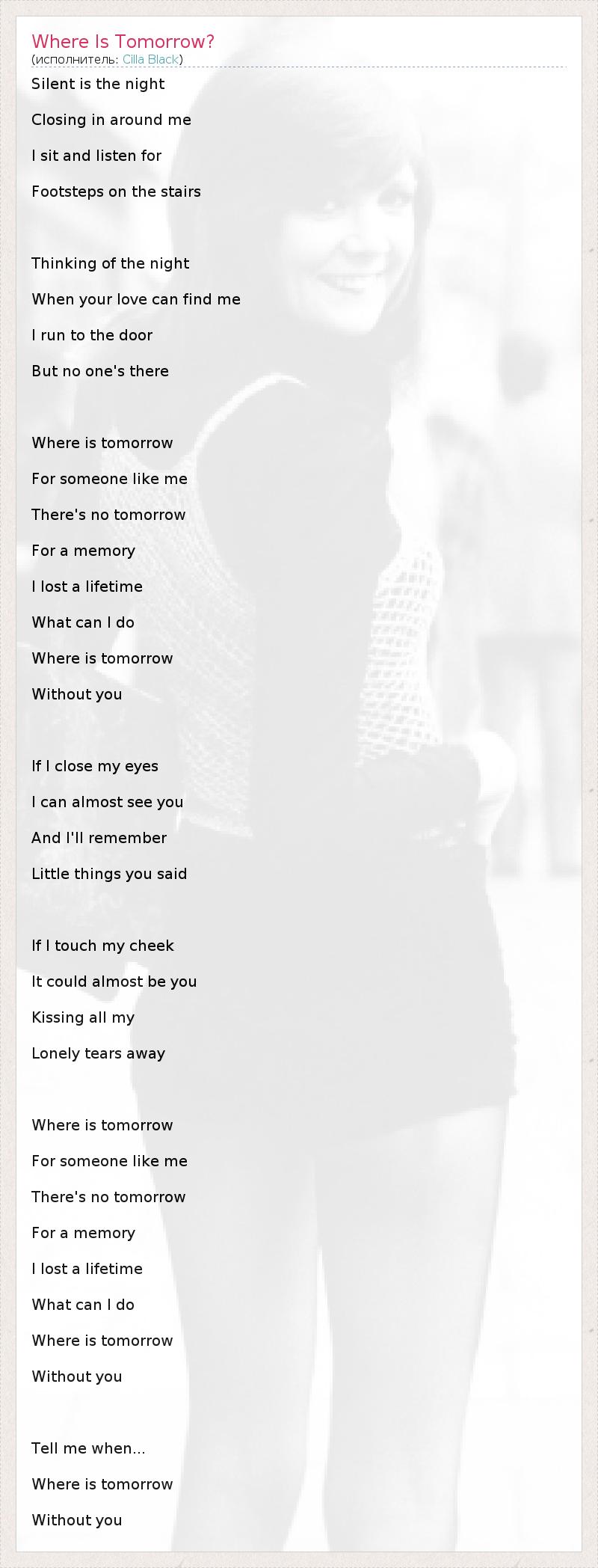 Silent is the night Closing in around me I sit and listen for Footsteps on the stairs Thinking of the night When your love can find me I run to the door But no one's there Where is tomorrow For someone like me There's no tomorrow For a memory I lost a lifetime What can I do Where is tomorrow Without you If I close my eyes I can almost see you And I'll remember Little things you said If I touch my cheek It could almost be you Kissing all my Lonely tears away Where is tomorrow For someone like me There's no tomorrow For a memory I lost a lifetime What can I do Where is tomorrow Without you Tell me when... Where is tomorrow Without you