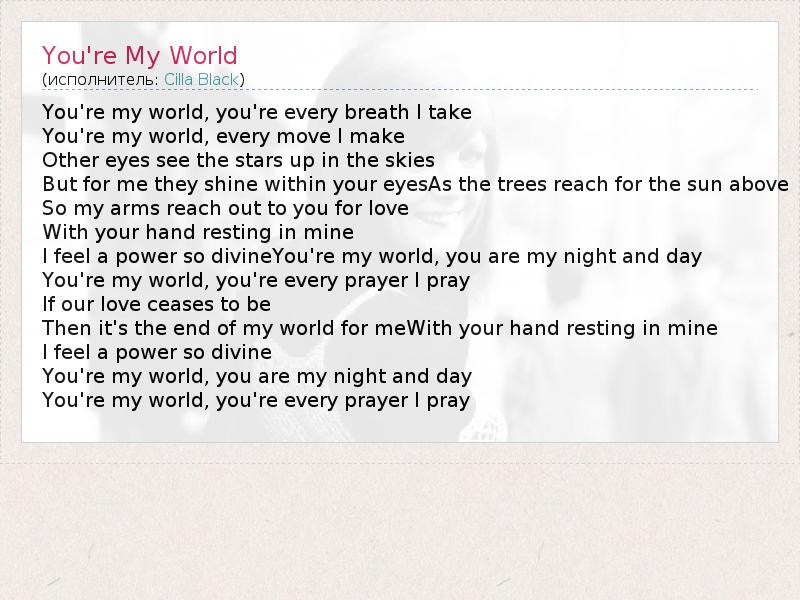 You're my world, you're every breath I take You're my world, every move I make Other eyes see the stars up in the skies But for me they shine within your eyesAs the trees reach for the sun above So my arms reach out to you for love With your hand resting in mine I feel a power so divineYou're my world, you are my night and day You're my world, you're every prayer I pray If our love ceases to be Then it's the end of my world for meWith your hand resting in mine I feel a power so divine You're my world, you are my night and day You're my world, you're every prayer I pray