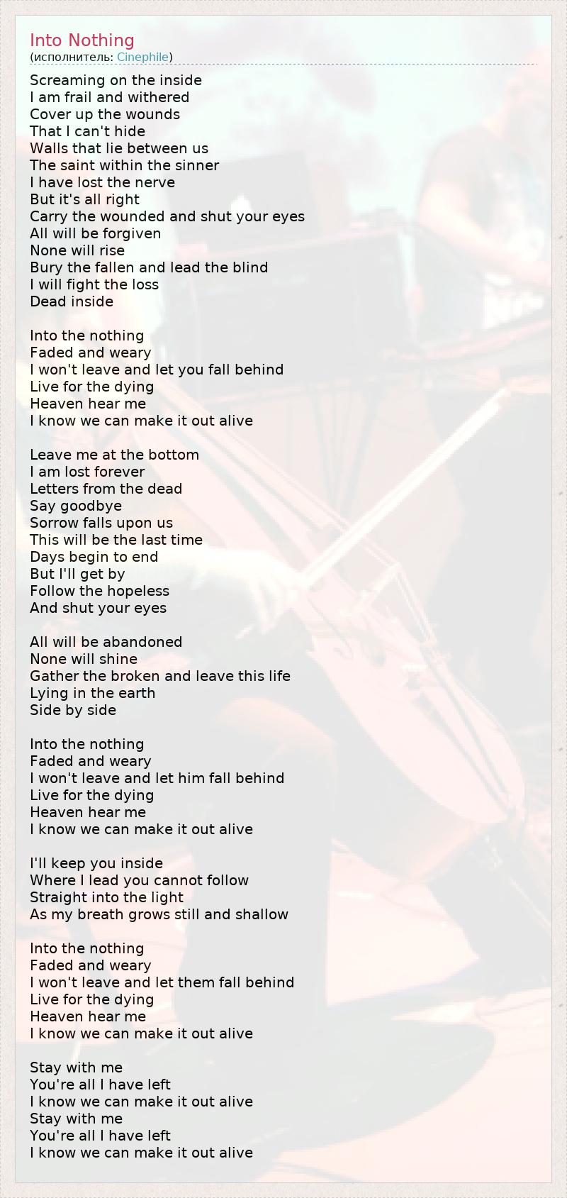 Кричащий внутри, Я непрочен и изнурен. Спрячь раны, Которые я не могу скрыть. Ложь воздвигает между нами стену - Праведник рядом с грешником. Я потерял мужество, Но всё в порядке. Перенеси раненого и закрой глаза, Все будут прощены, Ни один не поднимется. Похорони павших и проведи слепых. Я буду бороться с утратой, Мертвый внутри. Ухожу в никуда, Увядший и усталый, Я не уйду и не дам тебе остаться позади. Живу для того, чтобы умереть – Небеса, вы меня слышите? Я знаю, мы можем выбраться живыми Оставь меня на дне, Я навсегда потерян. Письма от мертвеца – Скажи: «Прощай». Скорбь набрасывается на нас – Это будет в последний раз. Дни подходят к концу, Но я выберусь, Последую за отчаявшимися И закрою твои глаза. Все будут брошены, Ни один не будет сверкать. Собери всех разбитых и вместе уйдите из этой жизни, Улёгшись в землю, Друг возле друга... Ухожу в никуда, Увядший и усталый, Я не уйду и не дам ему остаться позади. Живу для того, чтобы умереть – Небеса, вы меня слышите? Я знаю, мы можем выбраться живыми. Я удержу тебя внутри, Там, куда я поведу и куда ты не сможешь последовать - Прямо на свет, Пока моё дыхание не станет тихим и прерывистым. Ухожу в никуда, Увядший и усталый, Я не уйду и не дам им остаться позади. Живу для того, чтобы умереть – Небеса, вы меня слышите? Я знаю, мы можем выбраться живыми. Останься со мной, Ты – это всё, что у меня осталось. Я знаю, мы можем выбраться живыми. Останься со мной, Ты – это всё, что у меня осталось. Я знаю, мы можем выбраться живыми.