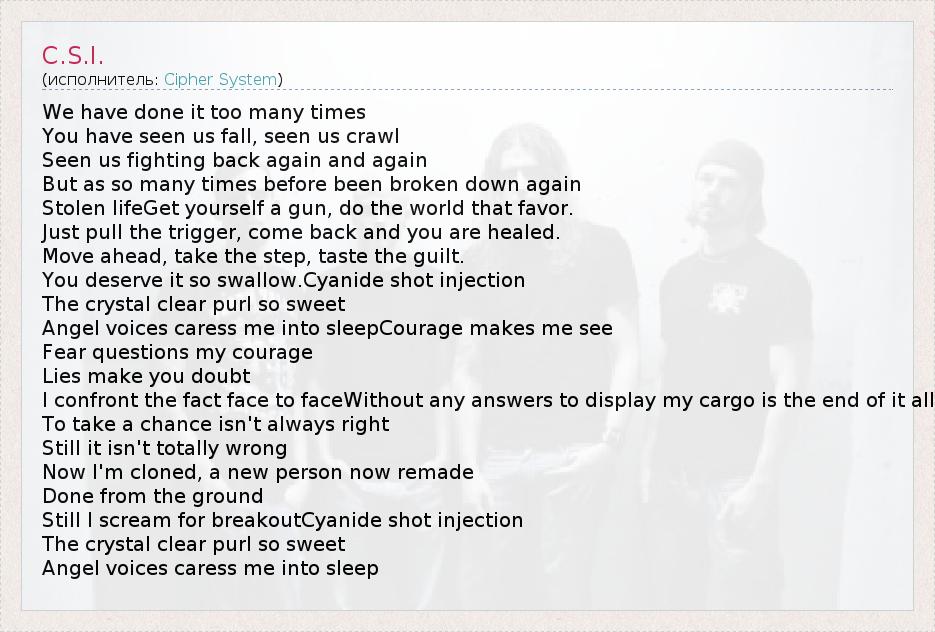 We have done it too many times You have seen us fall, seen us crawl Seen us fighting back again and again But as so many times before been broken down again Stolen lifeGet yourself a gun, do the world that favor. Just pull the trigger, come back and you are healed. Move ahead, take the step, taste the guilt. You deserve it so swallow.Cyanide shot injection The crystal clear purl so sweet Angel voices caress me into sleepCourage makes me see Fear questions my courage Lies make you doubt I confront the fact face to faceWithout any answers to display my cargo is the end of it all To take a chance isn't always right Still it isn't totally wrong Now I'm cloned, a new person now remade Done from the ground Still I scream for breakoutCyanide shot injection The crystal clear purl so sweet Angel voices caress me into sleep