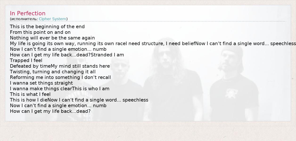 Это интересно:Cвоё начало группа берёт с конца 1995 года в Швеции. Изначально в группе было всего четыре человека (Johan & Andreas на гитарах, Pontus за барабанной установкой и Henric на басу). Основной проблемой было отсутствие вокалиста, он был найден только в 1997 году.После нескольких месяцев репетиций Cipher System, в то время именовавшиеся как Eternal Grief, наконец-то вошли в студию, в результате чего увидела свет демо-запись... продолжение