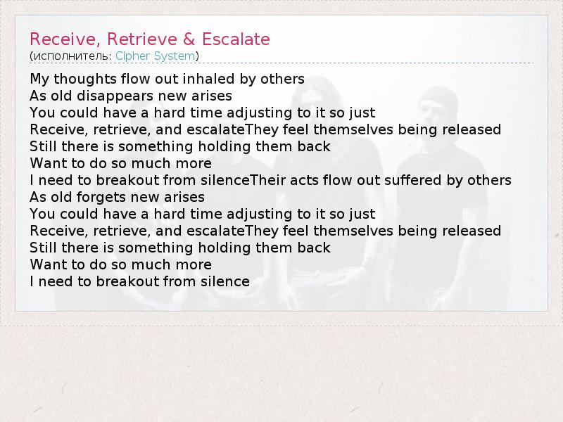 ГлавнаяИсполнителиCipher SystemReceive, Retrieve & Escalate